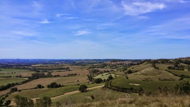 Day 2 we drove to Cordes sur Ciel… but the tourist office was closed and we had no map so we decided to move on. We stumbled across a town on a circuit of the local vineyards – 19km. It seemed ideal so we parked and went walking. The walk was undulating and it was hot… no shade meant we were getting burnt and by the end of the walk we were chasing from one bit of shade to the next. Bad news today – my feet have a few small blisters.