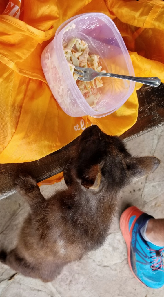 Onwards we walked until we found a bus stop. It was lunchtime so we decided we should make the most of this bench and eat. It wasn’t as scenic as the bench outside of Cades but it was a bench. As soon as we took off our bags we were joined by a cat. As soon as we opened the lunch bag another cat appeared… and then another. They meowed and meowed until I relented and broke up a cracker for them. They munched quickly and meowed for more… I thought to myself they must be really hungry as my gluten free corn crackers aren’t the tastiest of snacks! Gerry called one of the cats Ronnie Barker… for no reason at all… but the name stuck and we spoke to him on our return later! But for now lunch was over and we returned to our task.