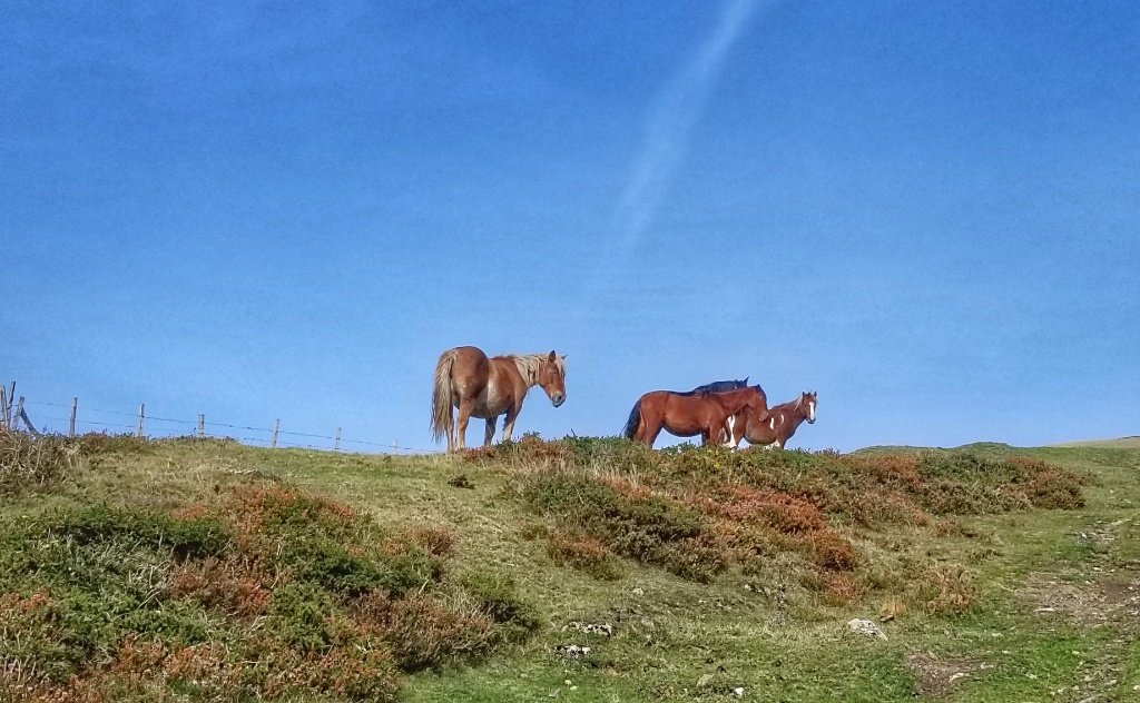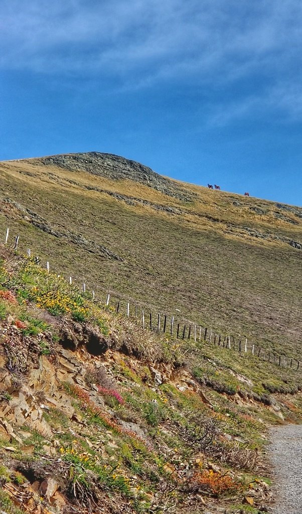 We dragged ourselves away. There was still more up to walk. A tractor passed and chugged his way up the hill. We watched him as he reached the very top. Slowly he was joined by one horse and then another and when he’d collected his little herd he made his way back down. On the back of his tractor was a bale of hay and he was obviously enticing the horses down to lower slopes with the promise of fresh hay.