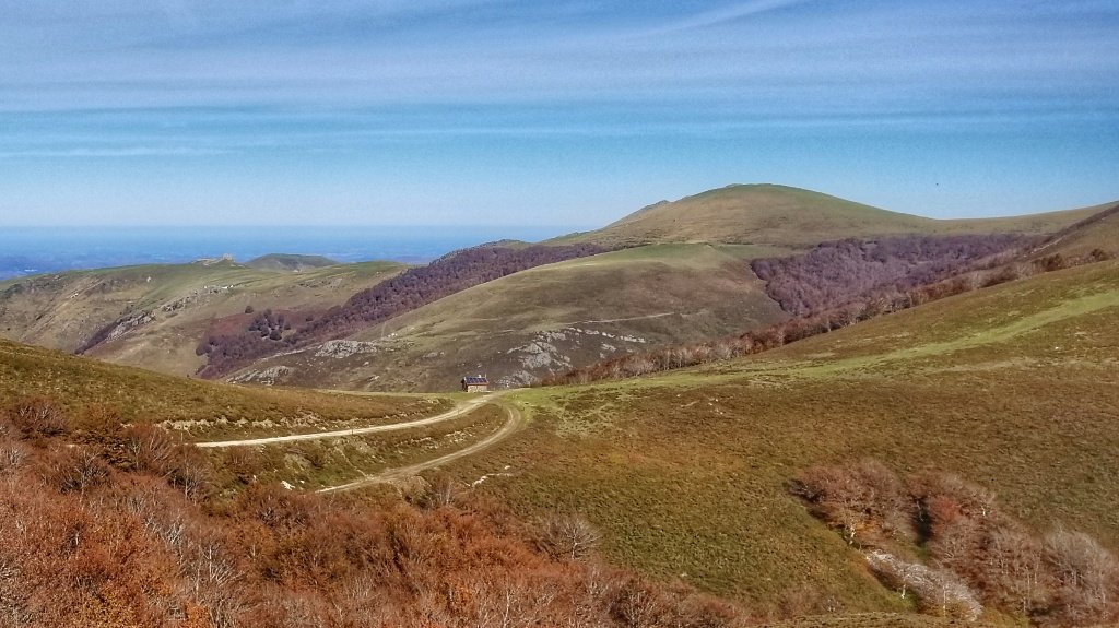 As we set off, all around us the guns of the hunters were going; some really quite close. I hate this! We have hunters at home and every year people are injured and killed in the name of sport… not to mention the destruction of the wild life! I was very glad when we’d walked up high enough to not hear the guns. Up and up and up and up. There was 4km of up, gaining about 600m in elevation. Some was along an old road now best left to 4 x 4’s or tractors. Sometimes we left the road and wandered on soft grass trails, albeit still steep! We took our time. Soaking in the views. We stopped halfway for a cup of tea and looked across at the bronze and moss coloured mountains and decided that it really didn’t take much to make us very very happy. Here we were, sat on a little grassy knoll with a hot cup of tea, looking out at such a stunning landscape.