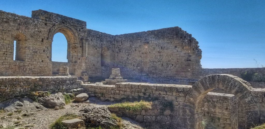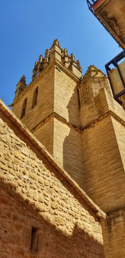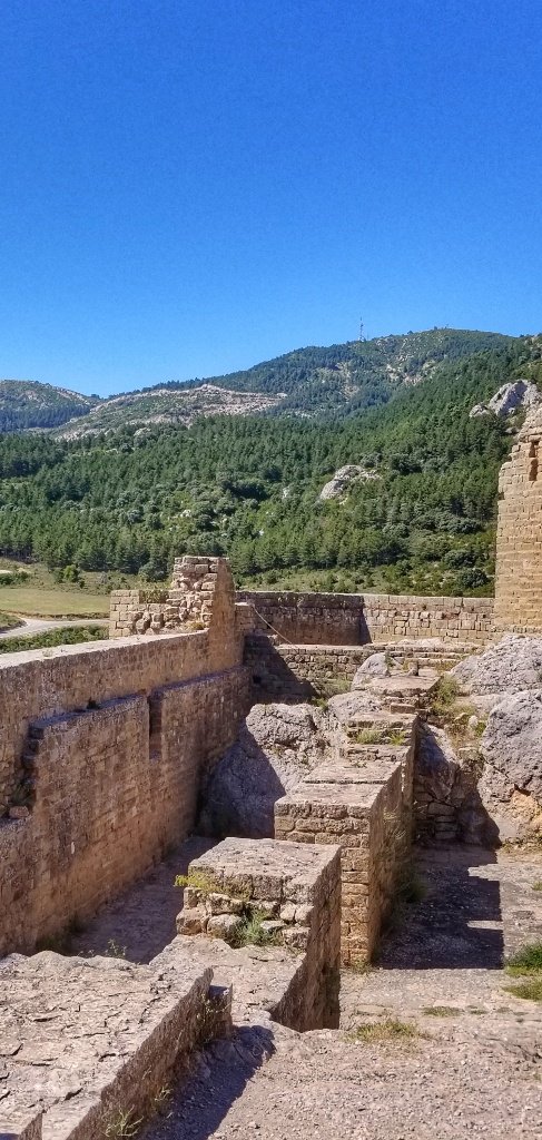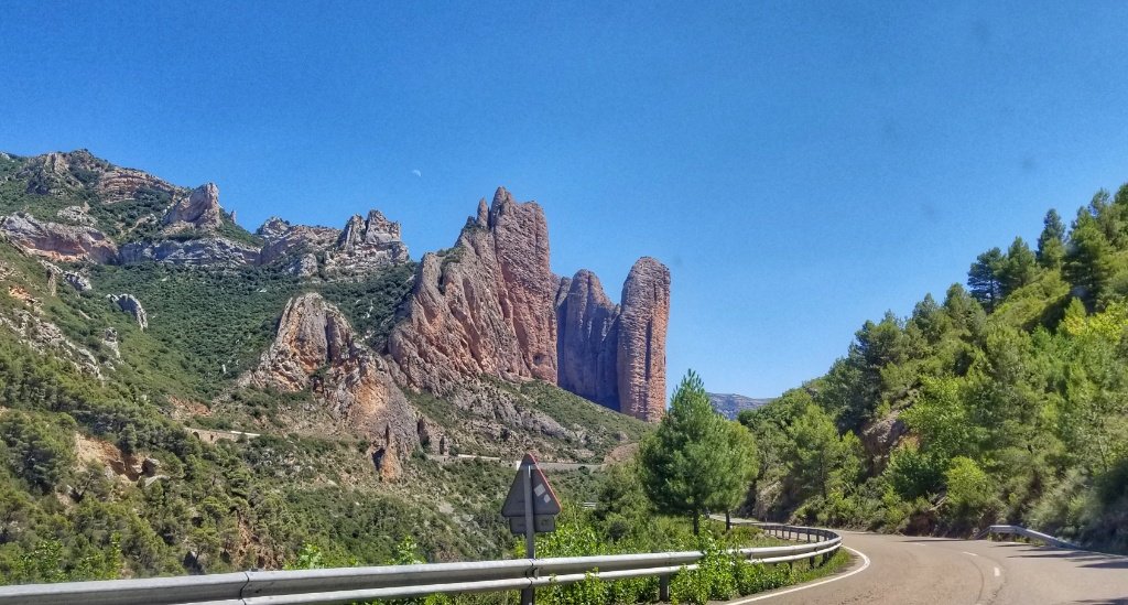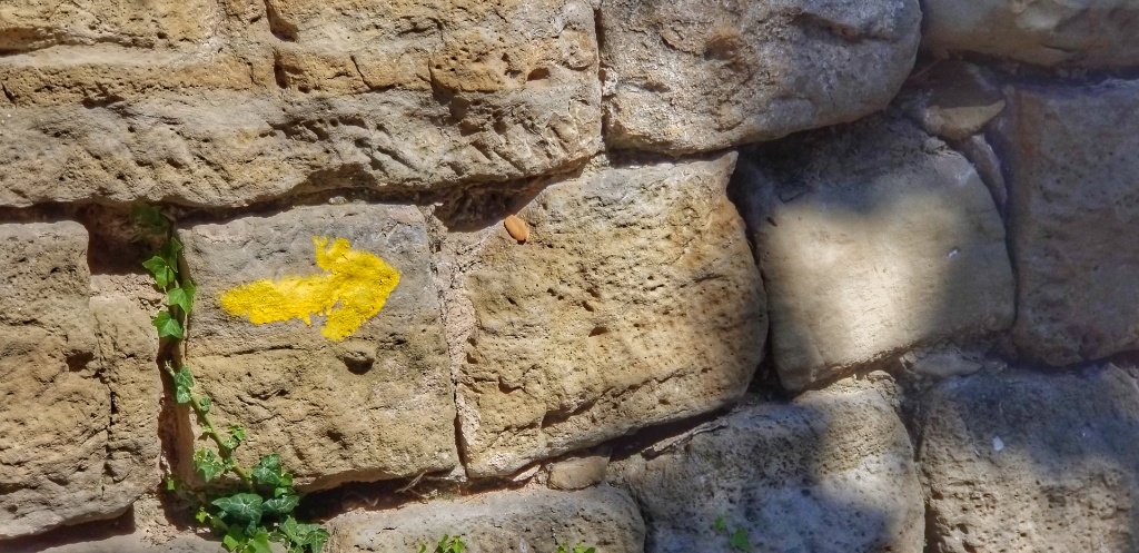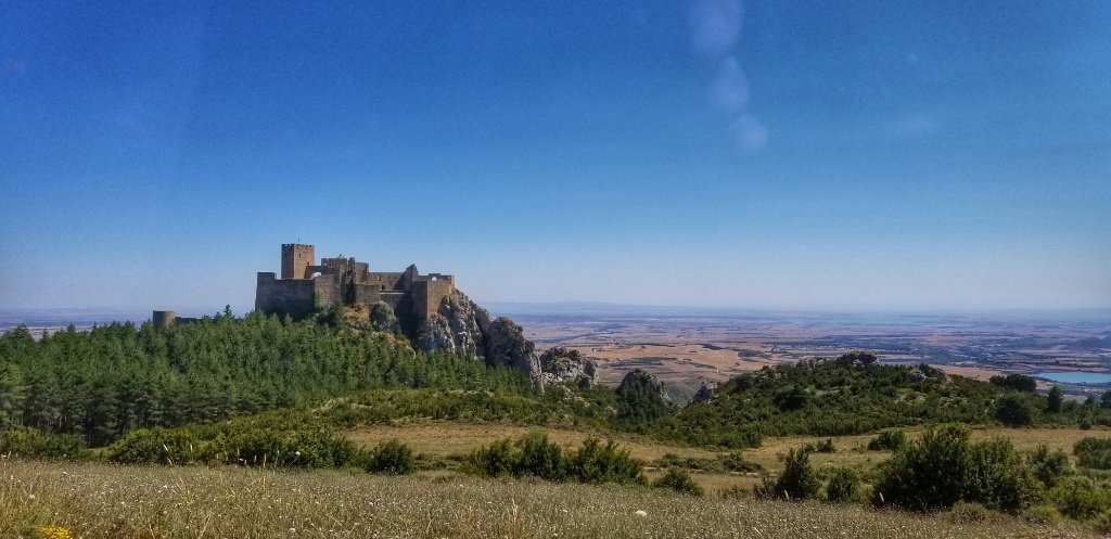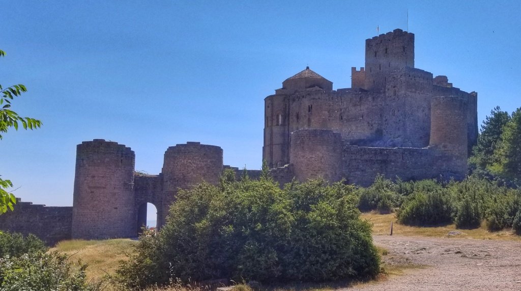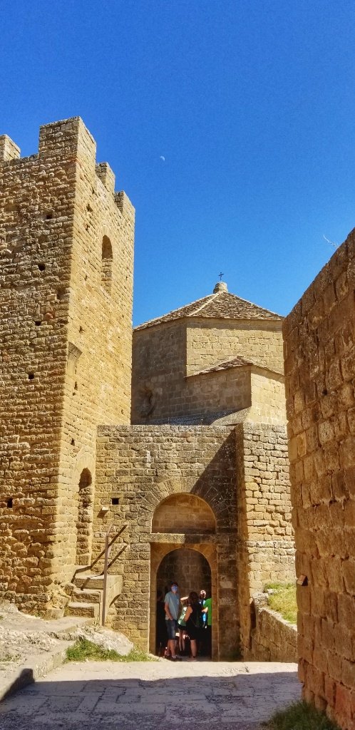 Back in the car we decided it was too early to return to our casa so we searched Trip Advisor and found a castle, far enough away to not be part of the Camino Aragones but close enough to reach that afternoon. The drive in itself was pretty amazing. 45 minutes over mountains and forest covered hills, driving along a river gorge and passing a huge embalse. After an hour we reached the village of Loarre and parked beside another ancient chuch; it’s steeple reminded me a little of the church in Iria Flavia. We wandered up the main square and ordered cold drinks… I had been amazed to spot yellow arrows en route and blow me if we hadn’t stumbled onto the Catalan Camino! I think Spain must be covered in these little yellow markers!