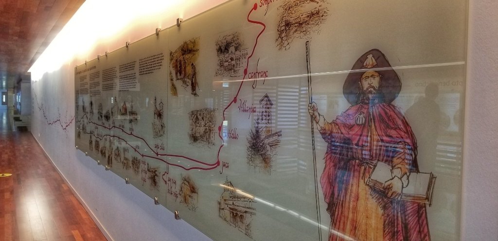 We meandered the site, gingerly walking over the glass floor that provided a birds eye view of the former monastery but was a little disconcerting to walk over. I was a little surprised to see a map of the Aragones camino route offering two different ways to Puenta la Reina on the Camino Frances. It has been majestically restored and it’s easy to see the craftsmanship.