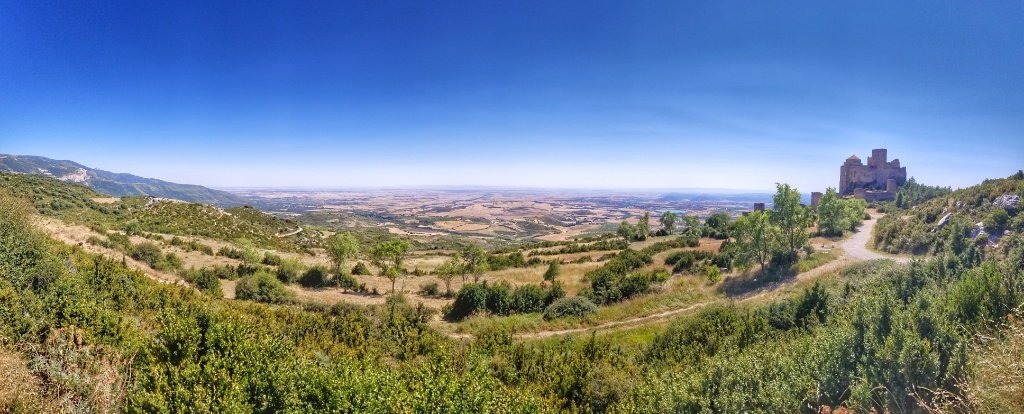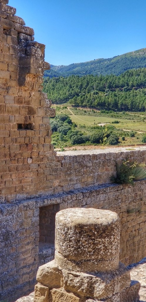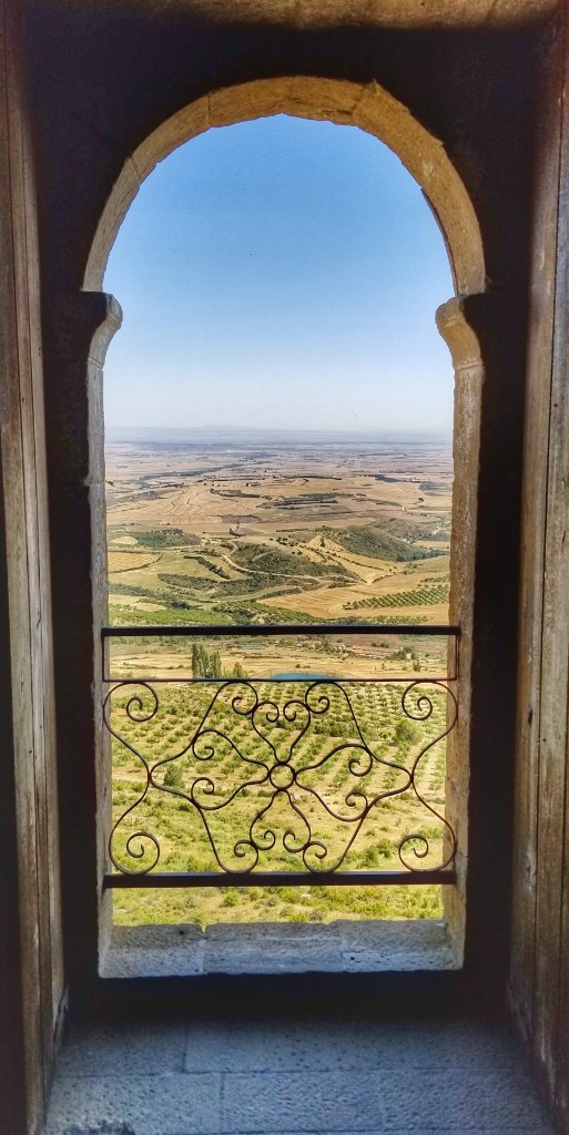 The castle’s location on a rocky outcrop affected the layout; it was not possible to have one unified structure, and like many castles, Loarre was a collection of buildings bounded by thick stone curtain walls. The outermost walls of the castle and their eight towers were erected in the 13th or 14th century. The church and castle have been the subject of numerous restorations, a major one in 1913 and anther during the 1970s. The exterior of the castle reminded us both of Beynac Castle, one of my favourite places at home in the Dordogne and the former home of Richard the Lionheart. This complex though seems much bigger and it’s location afforded views that stretched for miles and miles and miles.