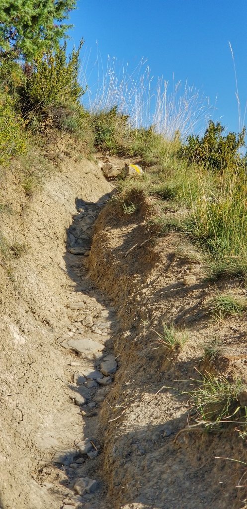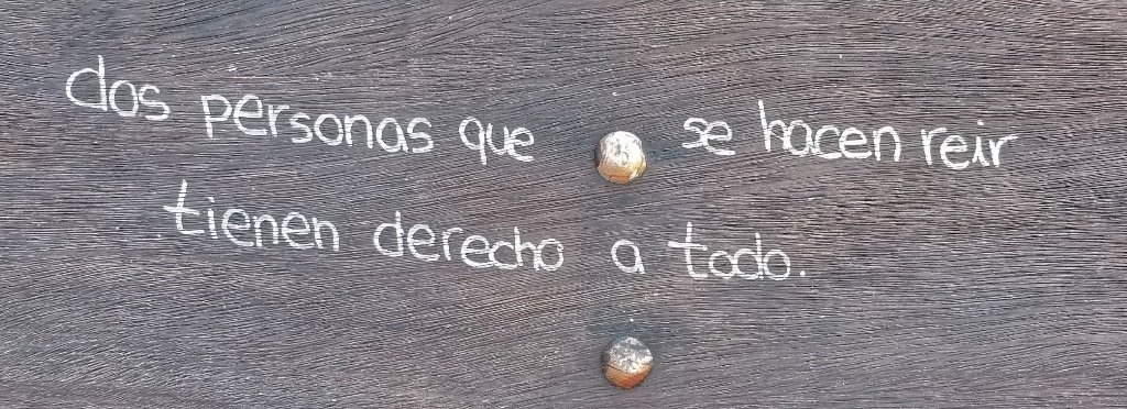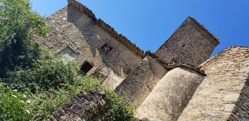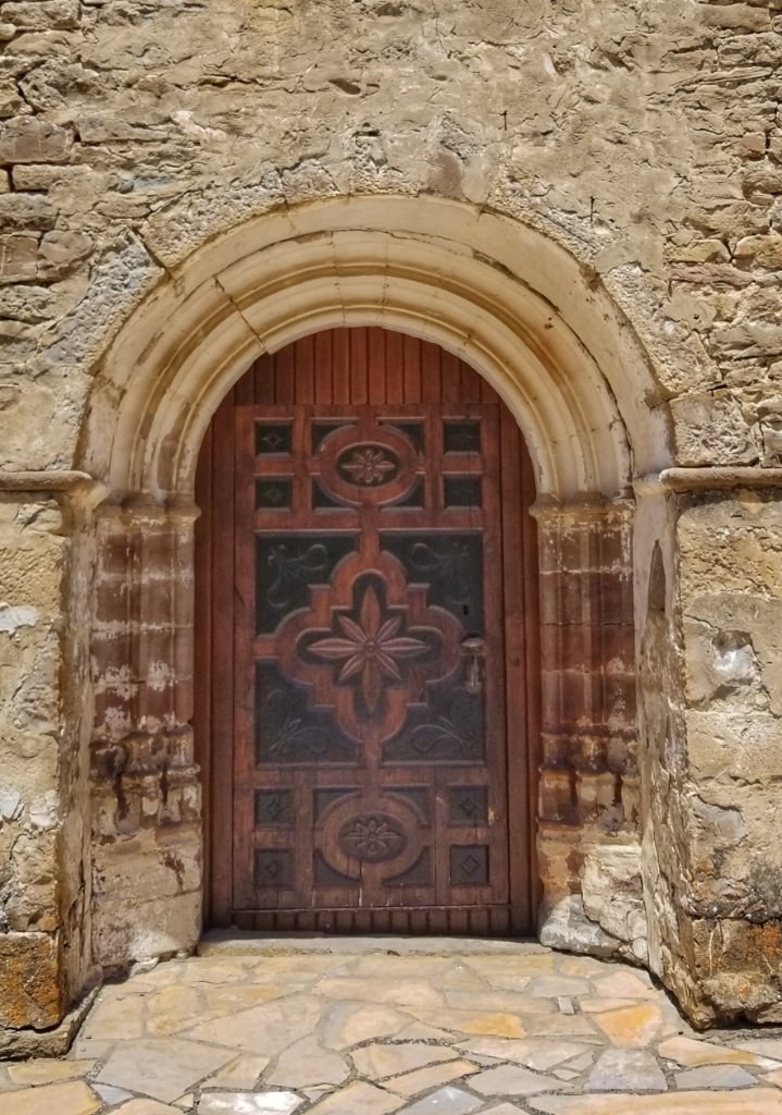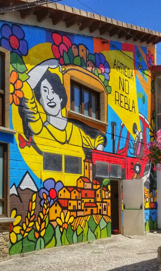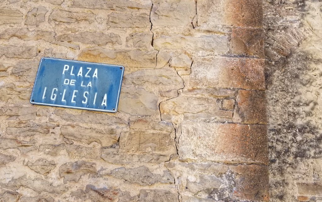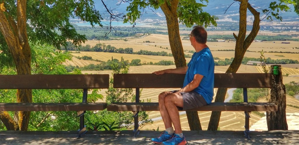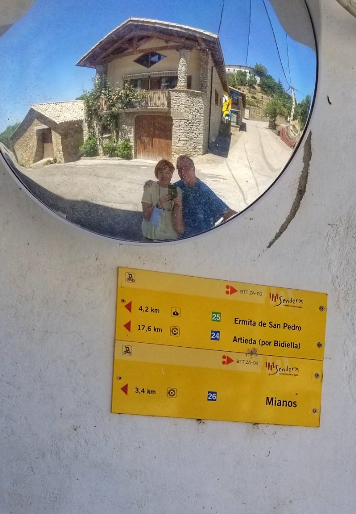 The plan was to drive to Artieda, have a look around the village and then walk back to Mianos. Just about enough of a walk for us today. Artieda was a very neat little village with a really lovely cool sitting area, perfect for a picnic if you’d had one! But not for us today… as Mianos was calling us. Onwards and upwards, along more fields of wheat. We had a bit of a beep beep from a jeep coming down the hill too fast and not expecting to see two pilgrims! but apart from that it was uneventful… albeit very hot! thank goodness for hiking umbrellas. Mianos is another village perched on a hill and partway up we found a bench. We think it says ‘two people who can make each other laugh have everything” – rather fitting for us so we took a seat and admired the view. I wanted to carry on up to the top of the village to see the church… they’re never open but I like to try! Gerry said that if I found anything fascinating then I should message for him to come quickly to see. He would save the bench for us in the meantime.