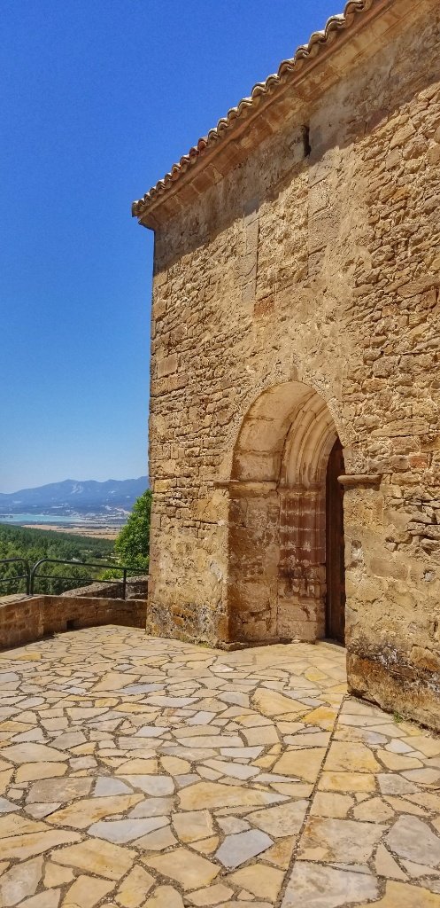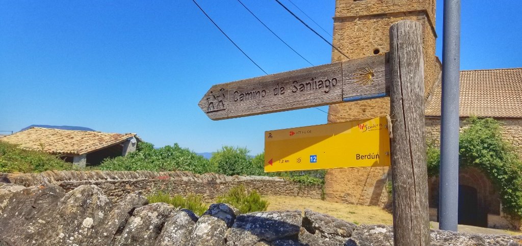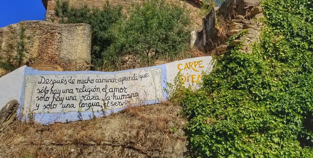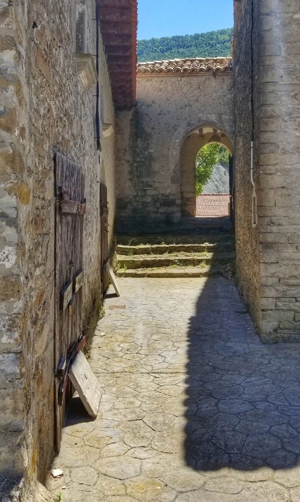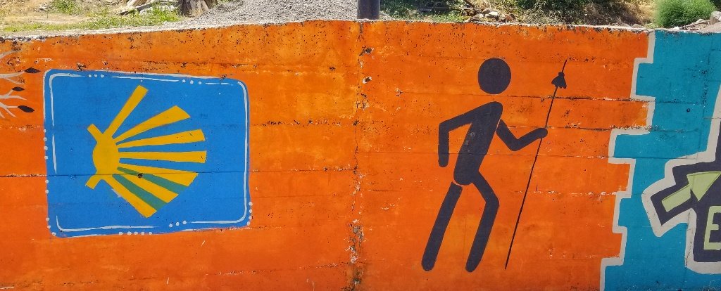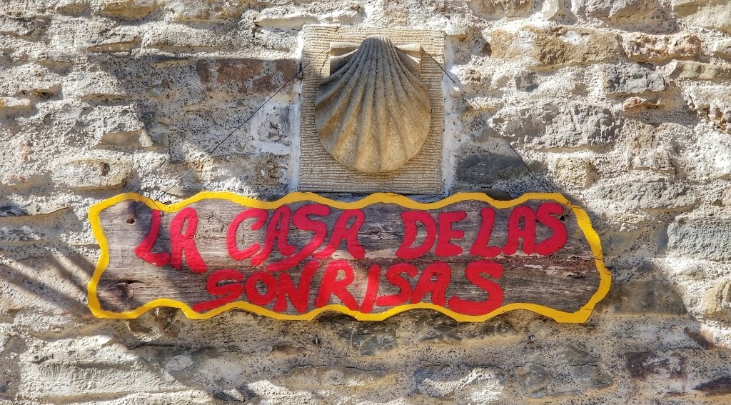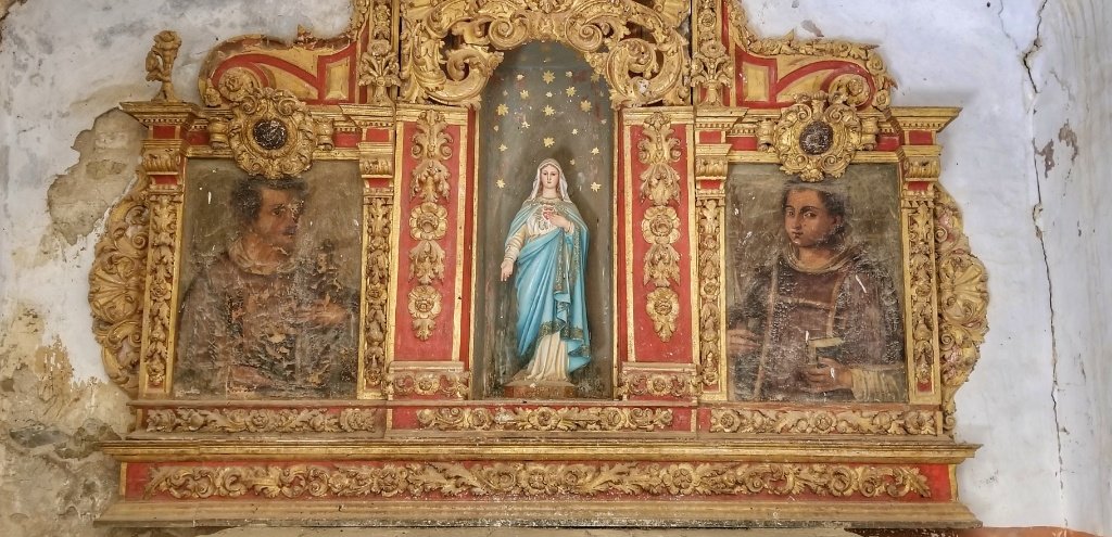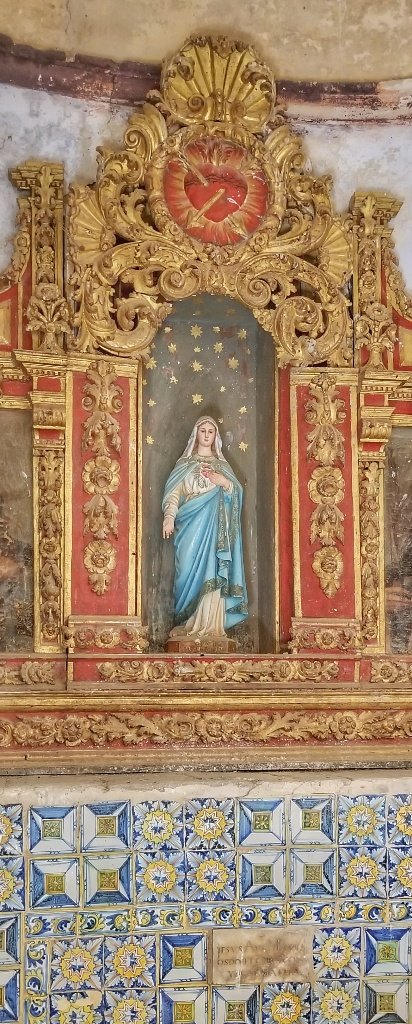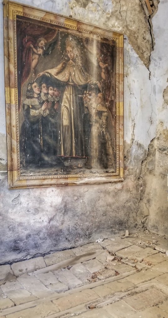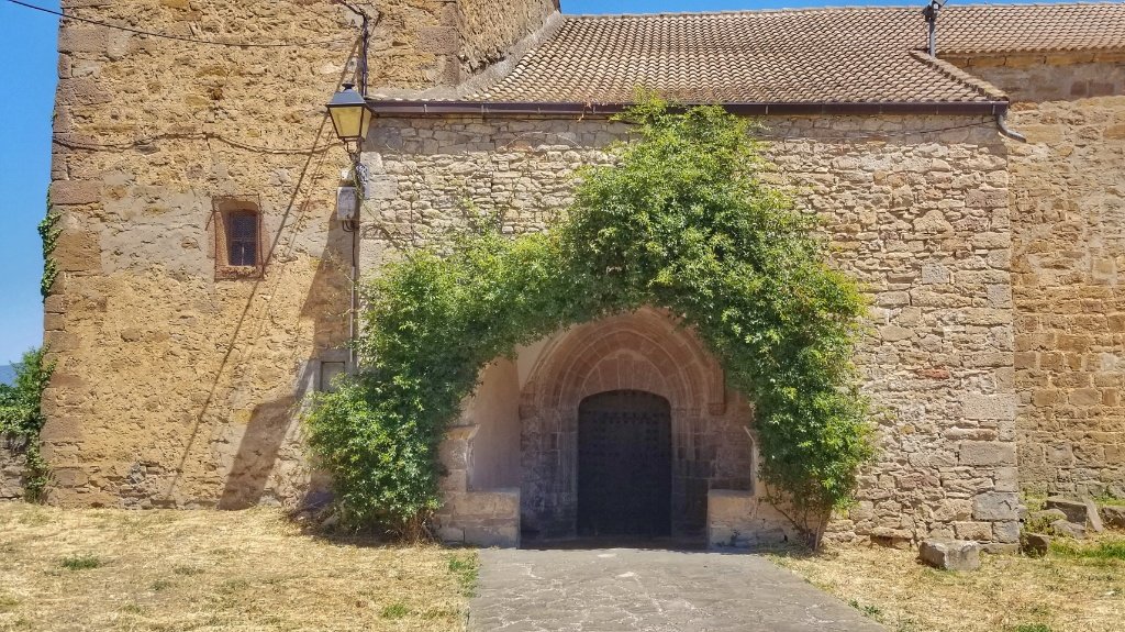 I wandered up to the top and I did indeed find something. So I messaged him. The signal was a bit slow so there was a few minutes delay but I heard him chuckle and assumed he’d seen it. What I’d found was a cool porchway with a seat opposite an old alter surrounded by old art… in a crumbling old building beside the church. Just there… for passing pilgrims to admire. Whilst at first Gerry scoffed at my message he soon agreed that I had indeed found something and sat in the cool and admired it.