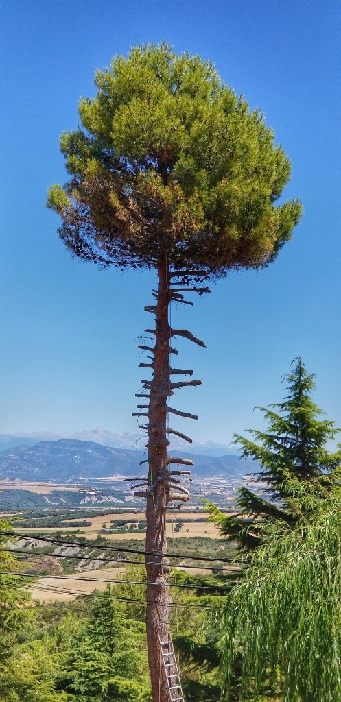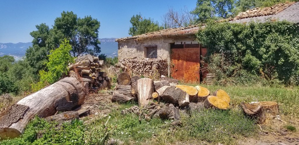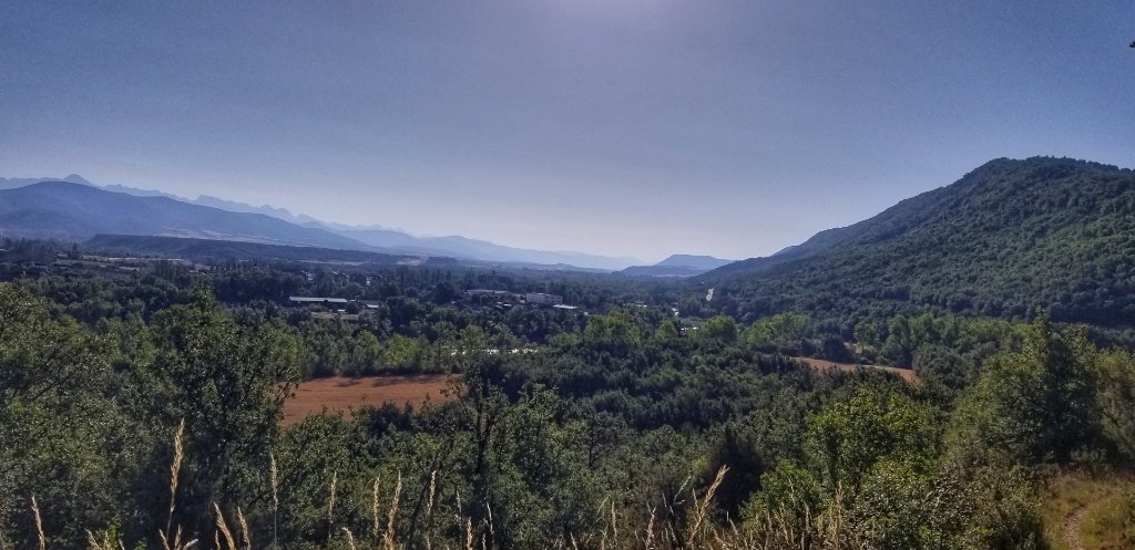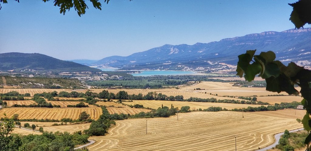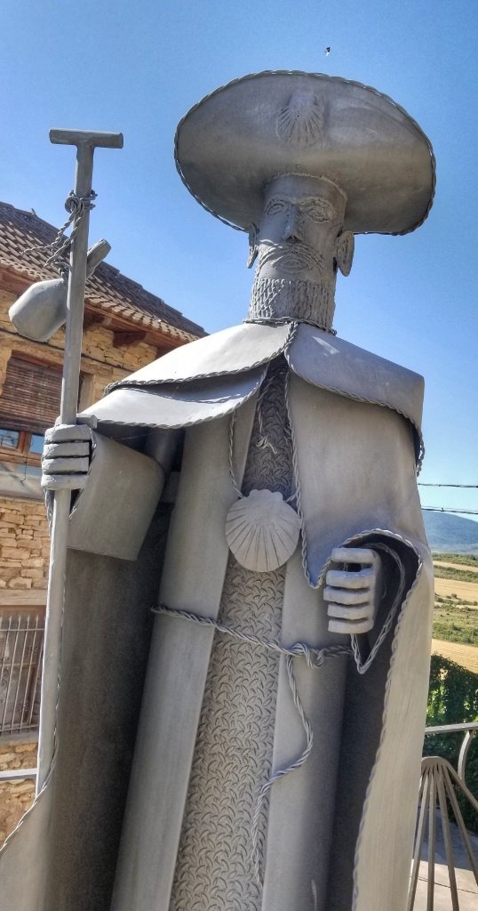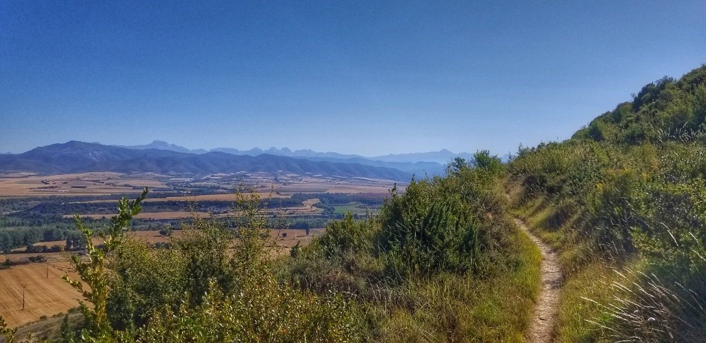It was here that we decided to test out Gerry’s ankle. There was a 4km stretch to Arres which we felt he would manage and from there we could decide to go on or return. The thermometer is rising and every day will now be over 30c so we wanted to get walking early. We started walking at 8:30 which wasn’t really early but not too late either. We crossed the queens bridge to reach the camino; sadly the original bridge was replaced and this one is nowhere near as grand as it’s namesake further north. It’s also quite narrow so crossing it with cars and lorries passing us was a little unnerving. Once on the other side we had to walk along the road for a while before turning off on to a much quieter smaller country lane; so small in fact that we had a rather hairy moment with a lorry as it had to squeeze past us! Thankfully all that we suffered was a blast of hot air from his engines as he drove by. But dodging tractors and large vehicles would be a bit of a theme today. But not right now as the arrows took us off the road and up into the hills.