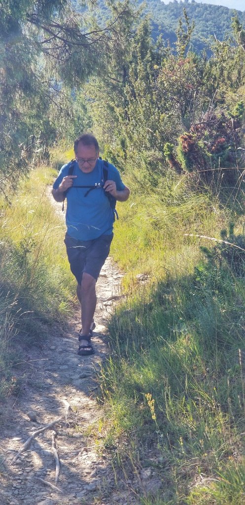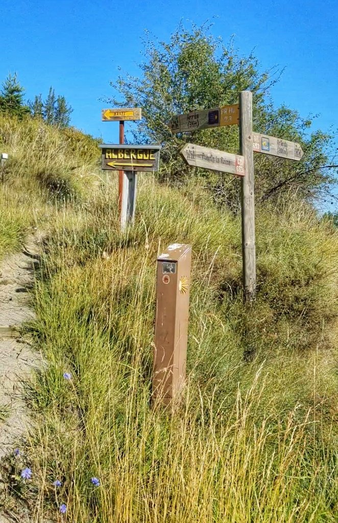 It’s Saturday and there were a lot of walkers on the trail. We seemed to get caught up in the local walking club and had to keep stopping to let them by; but they were walking in groups of 2 or 3 and then there was a gap until the next group… so there were many buenas and lots of putting on and taking off of masks. And it was difficult to make way as the trail was really very narrow. It was hard to put your feet side by side. Along the path there were the usual wide flowers but also prickly gorse and brambles and the odd christmas tree. We’re both wearing shorts and below the knees our legs are covered in tiny scratches… but regardless of the walking group and the plants it was a great walk and we were happy to be back on the camino.