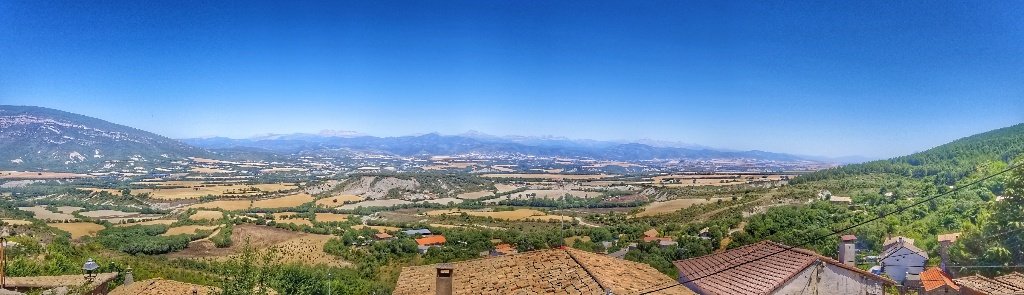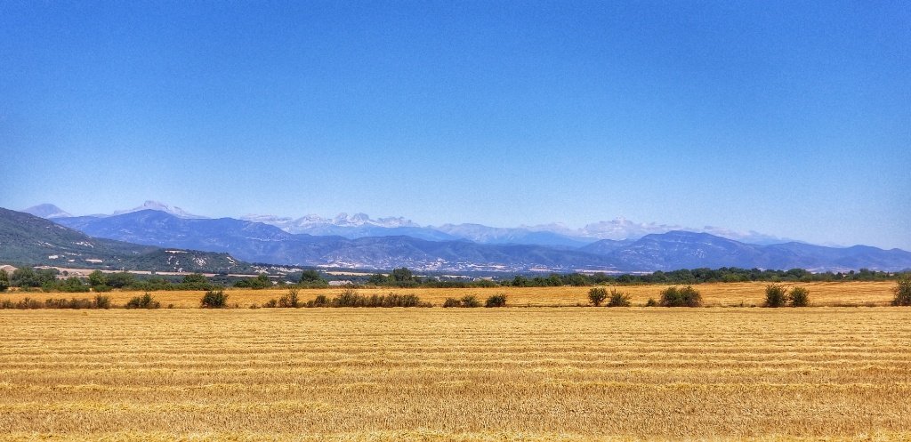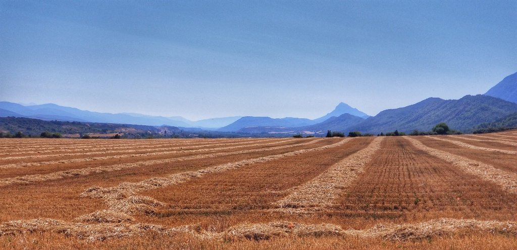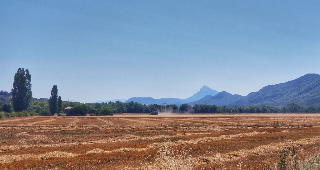 We considered what next. We felt it would be best to return via the road as the trail was stony and narrow and we’d climbed up a bit to reach Arres (pirate voice ). Gerry felt it would be quite difficult for him walking back down on that path; it is easier for him walking uphill with his ankle. So the road it was. And it would mean a change of scenery too. Once we’d finished our drinks we headed back. The sun was high and it was hot and there was no shade at all along the road. All around there was a buzz of tractors and combine-harvesters and lorries; today was clearly the day to harvest the wheat and the valley was alive with the sound of machinery. We watched one huge beast of a machine slowly make his way around a field. He would start on the outside and go round and round until he reached the middle. Support vehicles would go up and down the roads and every now and then we’d spot a group of chaps chatting beside their cars, watching the wheat being harvested.