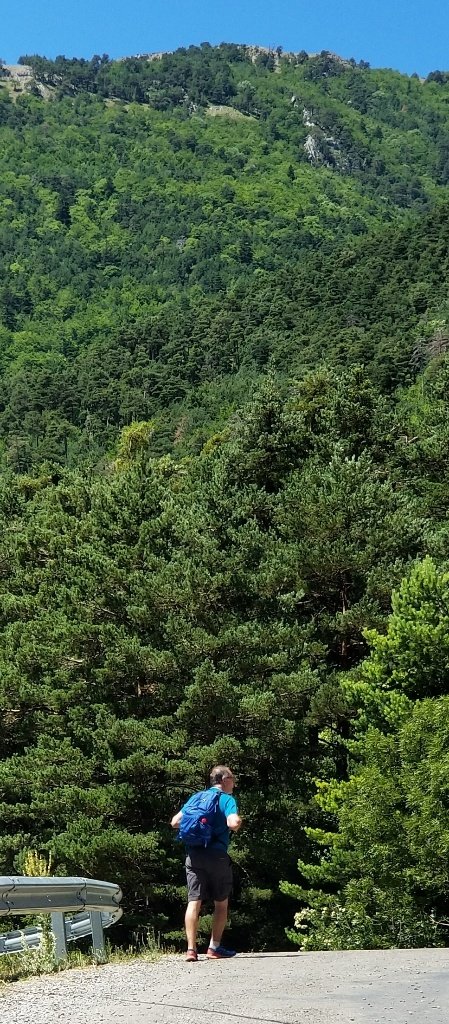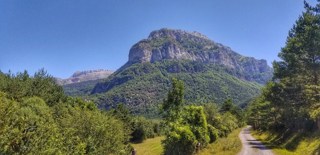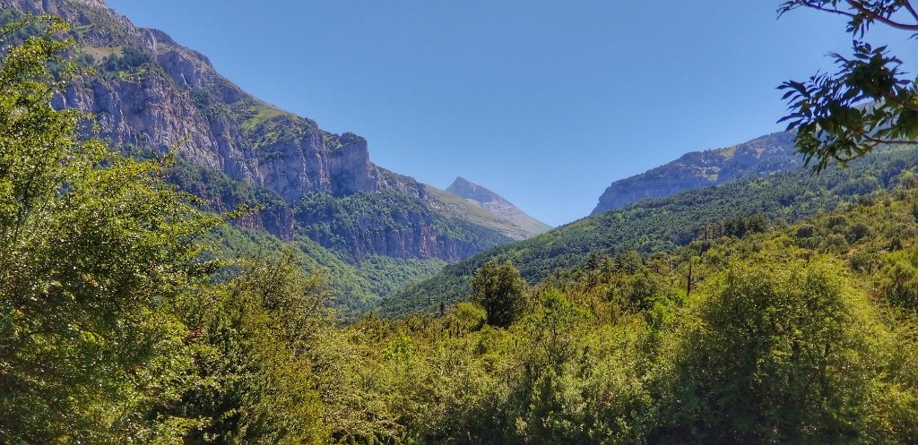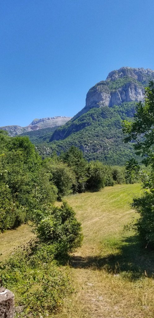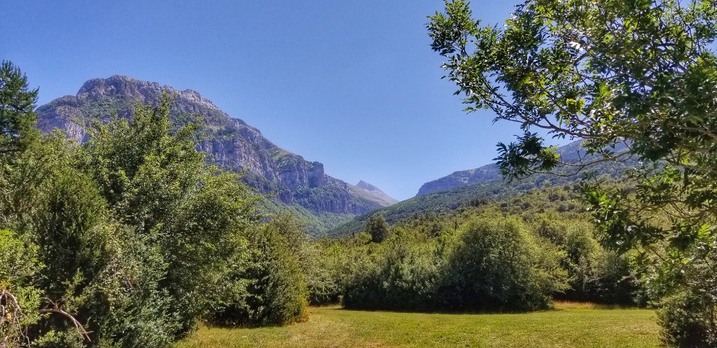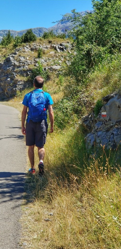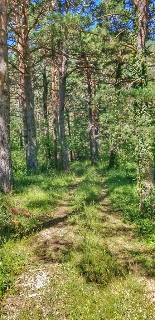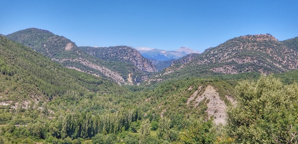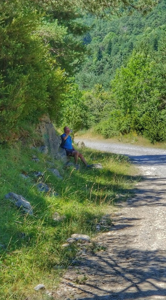 We set off towards Puenta la Reina. Every time we’ve driven that way we see a village high on a hill but we never notice it on the drive out. For the last few days we’ve said the same thing and so today we decided to pay special attention to try and figure out why we never see it… and why it was so invisible to us. All soon became very clear. It was our village! We chuckled to ourselves as we continued along the road. Unlike the last few days instead of turning right to follow the camino we turned left and headed back towards the mountains. The first section of the road was long and straight; surely it must be roman? Onwards we went and the air grew a little cooler and the grass a little greener and the hills a little taller! We were driving through the Hecho Valley and we decided to keep driving onwards beyond Siresa towards the mountains. We would have loved to keep driving higher but time was against us and we decided to stop in a large layby which seem to have several marked trails and the possibility of a walk to a campsite (with a bar). Oh it was glorious to be back in the mountains! All around there were views. We meandered and picked a trail. We crossed a bridge over a river gorge and on one side was a rocky river and the other a deep pond like section. It was so hot that if we had been able to, I would have gone for a swim! But Gerry had his mind on a cafe con leche so we carried on. The trail took us first down and then up, up and up but thankfully with shade from a pine forest. Every so often we’d pop out from the trees and have a view of the peaks around us. A few kilometres later we reached a campsite and on the far side of the the site with a fabulous view was the bar. We sat in the shade and cooled down in the mountain breeze. This was a good plan!