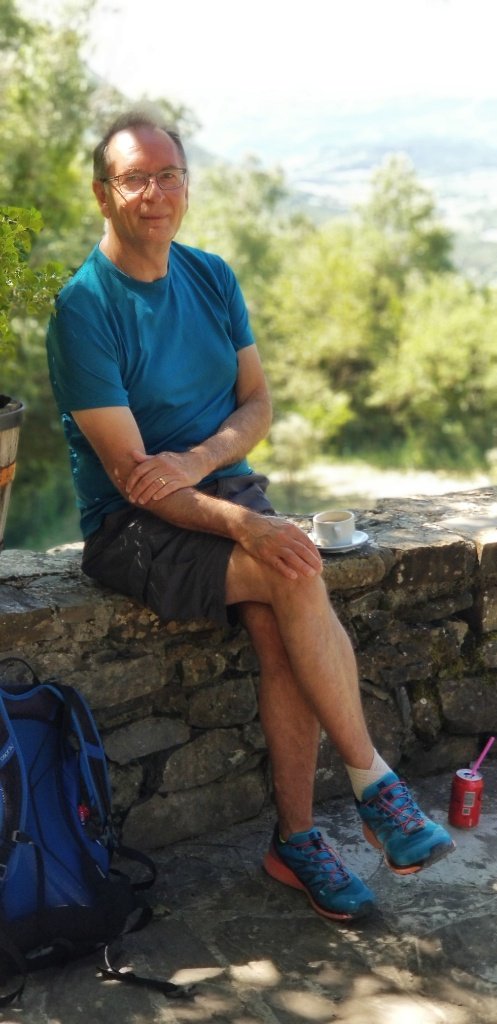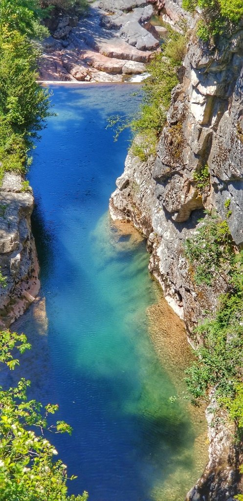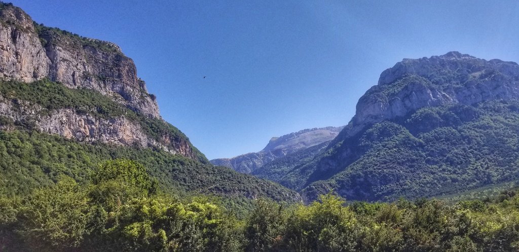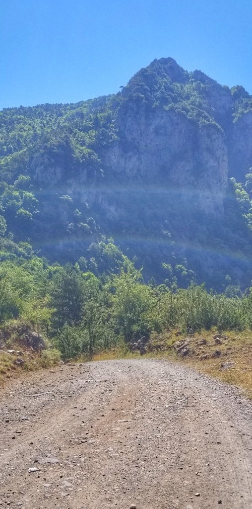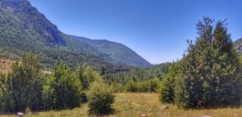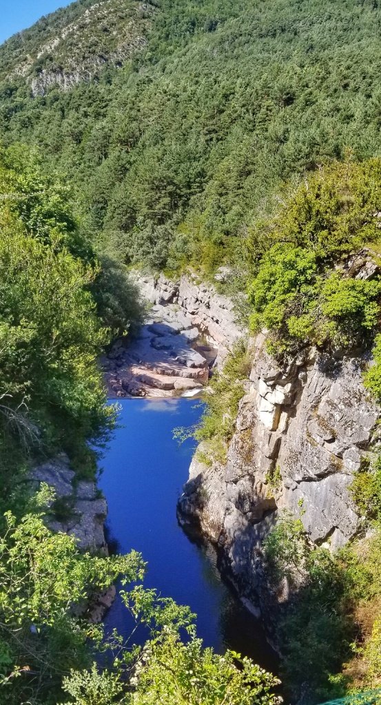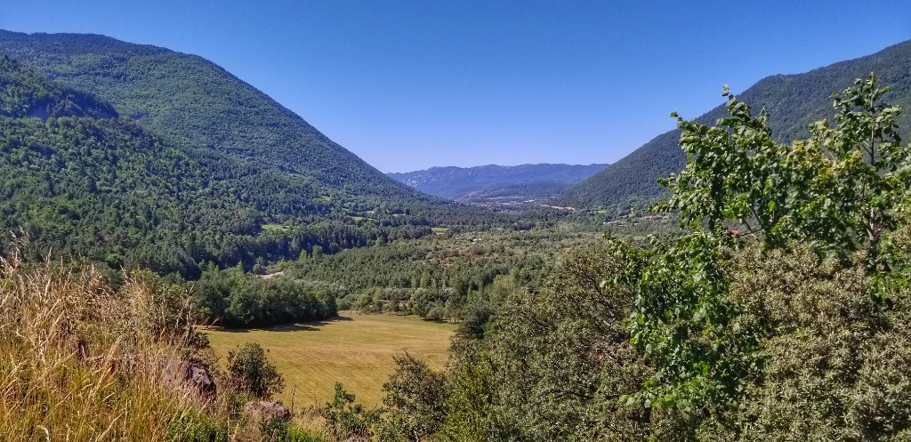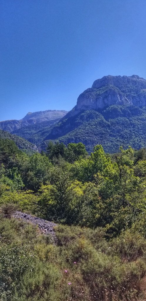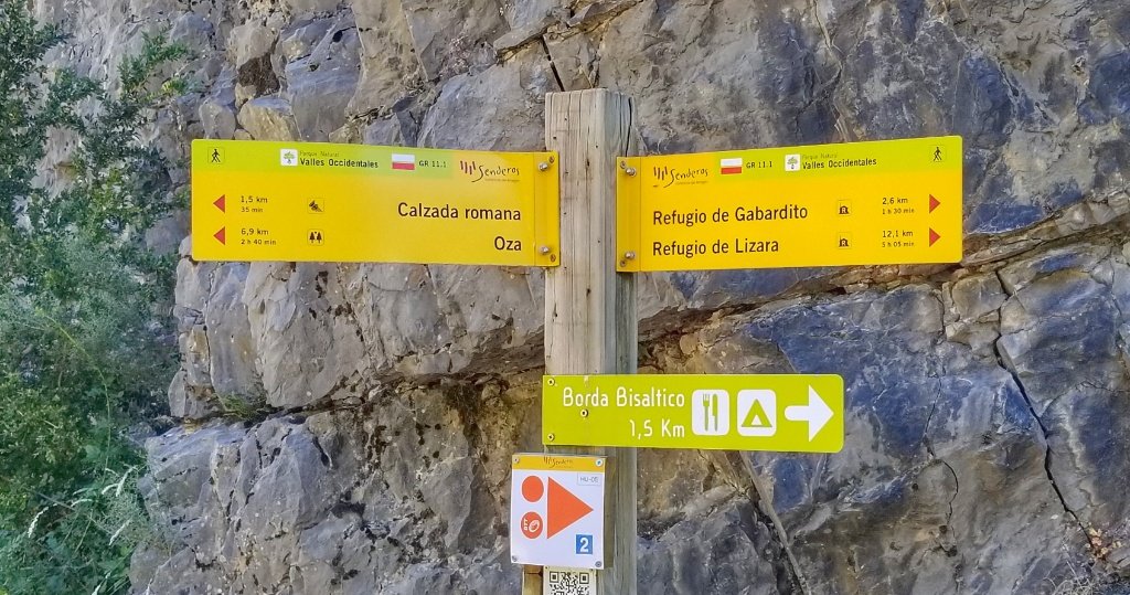 We set off towards Puenta la Reina. Every time we’ve driven that way we see a village high on a hill but we never notice it on the drive out. For the last few days we’ve said the same thing and so today we decided to pay special attention to try and figure out why we never see it… and why it was so invisible to us. All soon became very clear. It was our village! We chuckled to ourselves as we continued along the road. Unlike the last few days instead of turning right to follow the camino we turned left and headed back towards the mountains. The first section of the road was long and straight; surely it must be roman? Onwards we went and the air grew a little cooler and the grass a little greener and the hills a little taller! We were driving through the Hecho Valley and we decided to keep driving onwards beyond Siresa towards the mountains. We would have loved to keep driving higher but time was against us and we decided to stop in a large layby which seem to have several marked trails and the possibility of a walk to a campsite (with a bar). Oh it was glorious to be back in the mountains! All around there were views. We meandered and picked a trail. We crossed a bridge over a river gorge and on one side was a rocky river and the other a deep pond like section. It was so hot that if we had been able to, I would have gone for a swim! But Gerry had his mind on a cafe con leche so we carried on. The trail took us first down and then up, up and up but thankfully with shade from a pine forest. Every so often we’d pop out from the trees and have a view of the peaks around us. A few kilometres later we reached a campsite and on the far side of the the site with a fabulous view was the bar. We sat in the shade and cooled down in the mountain breeze. This was a good plan!