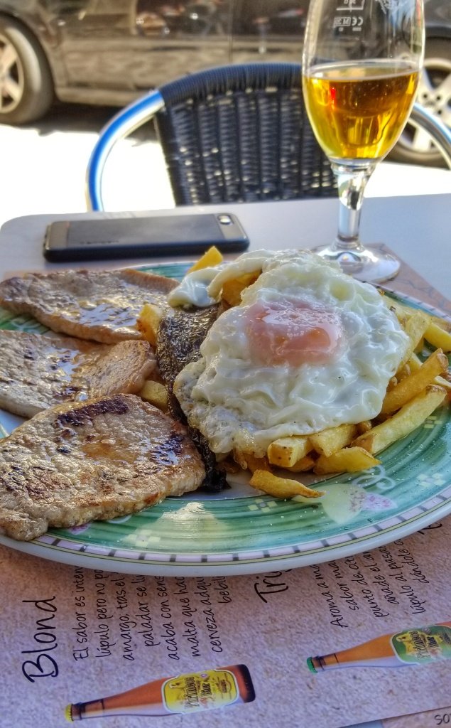 Back in the car we congratulated ourselves on a good choice! And headed back to Siresa where we hoped we’d find another plate of something nice for lunch. I had my eye on chicken but I’d told Gerry about Platos Combinados and he was already sold on that idea. We arrived in the village just as someone left so we grabbed their parking spot and we arrived at the cafe just as another couple left so we grabbed their table in the shade. Emboldened by his efforts yesterday Gerry again decided to order… and 15 minutes later Pollo y Papas arrived for me and a rather generous looking Cerdo Heuvos y Papas arrived for his nibs. I’m glad we did the walk in the morning because I don’t think we’ll be walking much this afternoon! It was a great little find and we sat amongst the locals all meeting and greeting and enjoying a cool drink and a few olives with their friends.