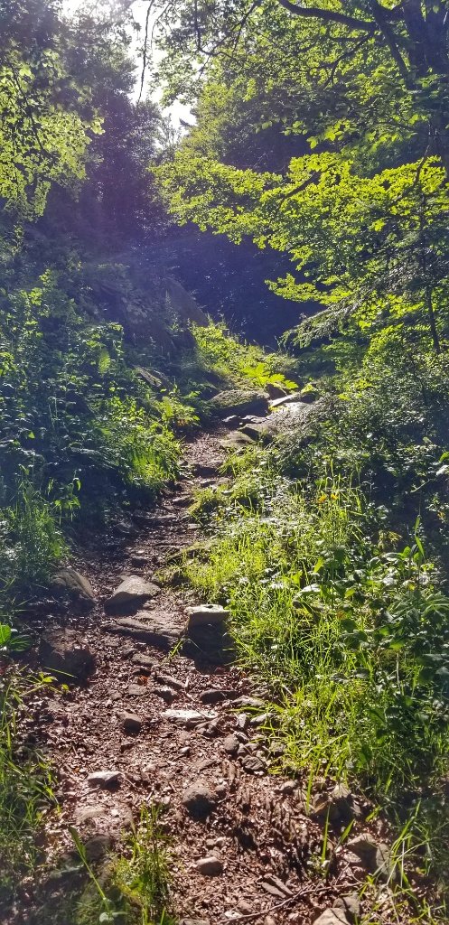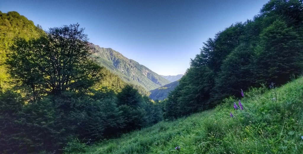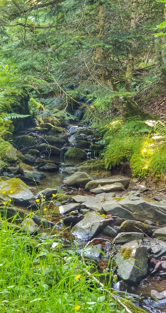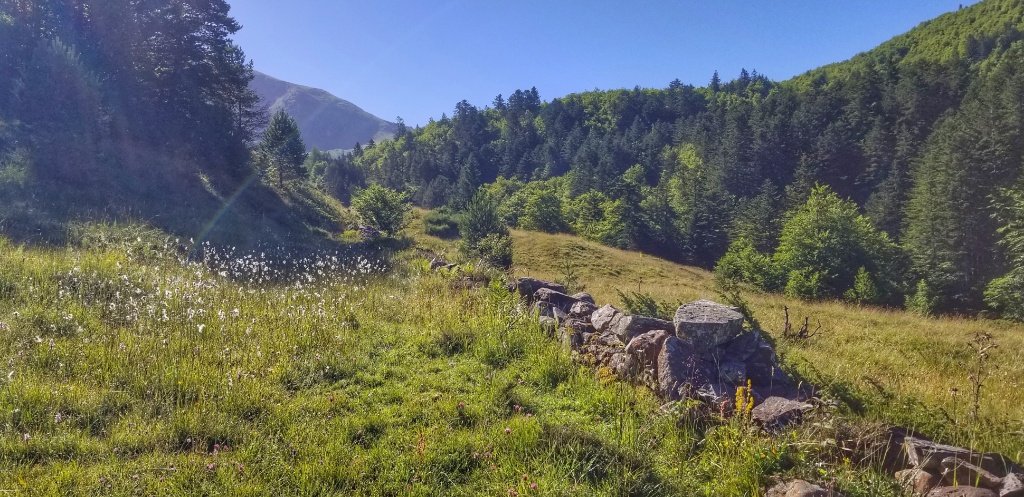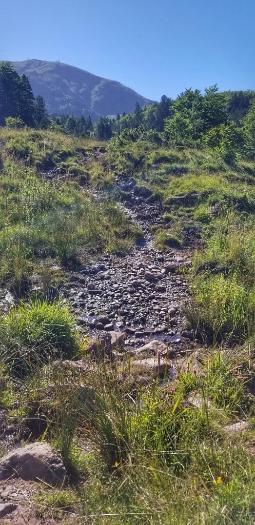 Onwards and upwards we walked. Sometimes it was quite gentle, through green green meadows full of summer flowers and sometimes it was quite steep, through forests with great ferns pushing up from the river edge that we scrambled along. This walk is nothing like the crossing from St Jean and the path is much more rustic. In places the grasses and foliage had engulfed the trail and in other places wet sticky mud and mountain streams meant we were jumping across stepping stones to continue. The walk from St Jean to Roncesvalles offers big wide open views where as this walk is more contained, but all the while today the sun shone, the sky was the bluest of blue and the views were simply majestic.