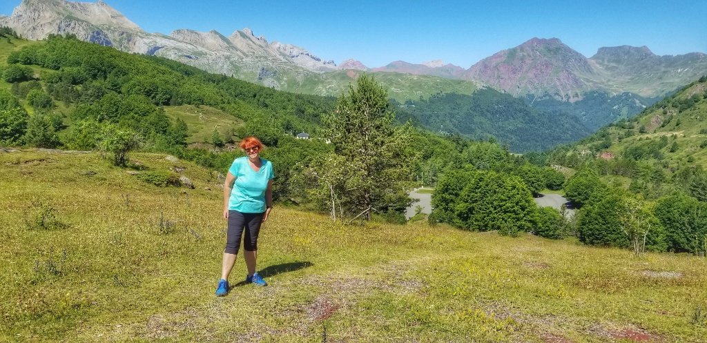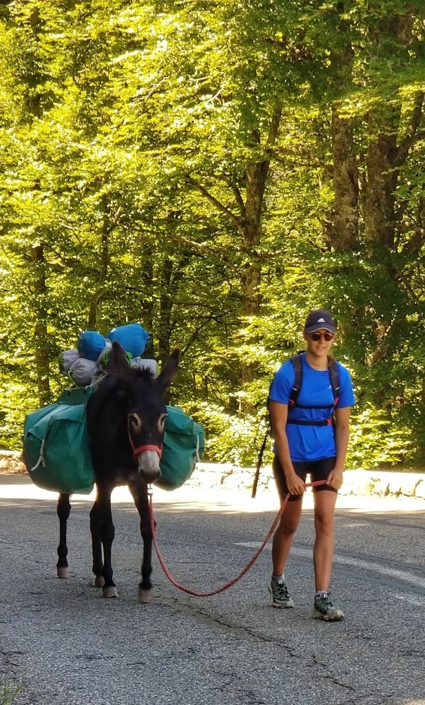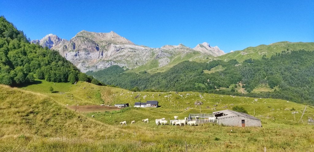 Once we’d rested it was time to get moving again. Somport is the start of the Camino Aragones. If we were walking normally we would have continued onwards to Canfranc and maybe spent the night opposite the big station… instead we were heading back down the mountain. We decided that we would stick to the road. There were places on the way up with rocks to scramble across. It’s fine on the way up but not so easy on the way down if you can’t bend your ankle. And it was a good choice as we had a very different view on the way down via the road. Down and down passing the cows and the sheep and the farmers, we even passed a girl walking up with a donkey! It reminded me of my first dalliance with the Camino in 2013 when Gerry gave me Spanish Steps by Tim Moore; the idea was that it would put me off wanting to walk but ended up being one of my favourite books and encouraged me even more to follow in his (and Shinto’s) footsteps.