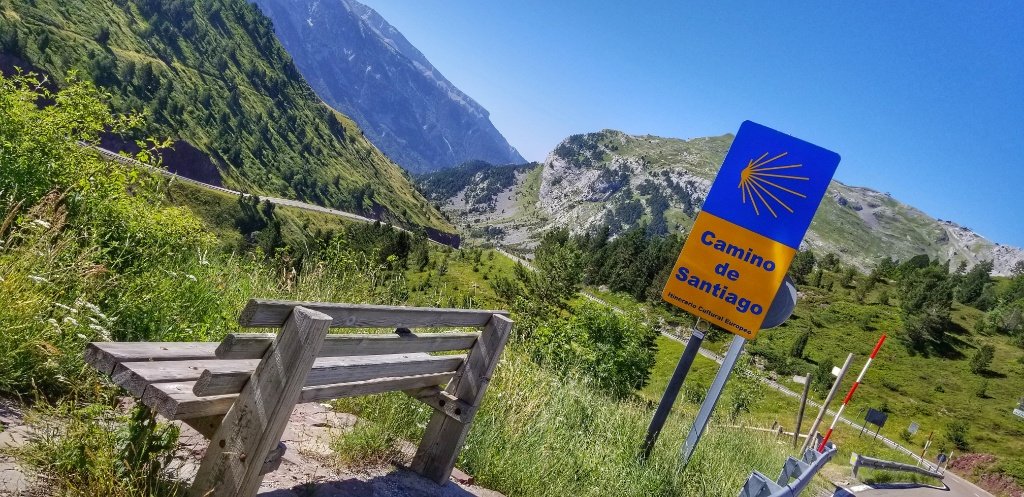 There was a hotel or some kind of centre that was closed, and another hotel with a big for sale sign on it. A few metres further was the border. Gerry walked across and shouted back “stay there and we can have a long distance relationship!” I ignored him and walked across to join him. I’ve walked from St Jean to Roncesvalles 5 times but for Gerry this is the first time he’s crossed a mountain pass. He reminded me that he has walked from Hendaye to Irun before but that’s not quite the same! We wandered on because in Spain there was a bar! We first found a seat in the shade but actually felt chilly so changed to a place in the sun. Gerry ordered and I looked at my photos… and then I just looked at the view. Oh how I longed to just keep walking. Our ‘there and back’ camino is great and I know we’re lucky to be here in these difficult days but gosh it’s not the same as walking forward to the horizon and beyond every day… and I long for the time when we can do that again without fear.