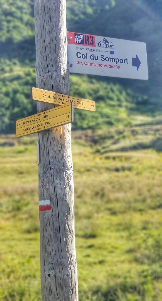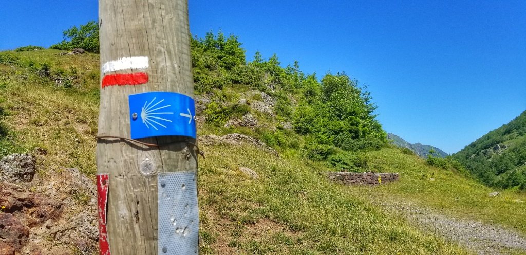 One of the problems with our ‘there and back’ camino is that we always need to find a spot where the camino is near a road and where we can park. In the mountains and in these rural areas that’s never easy and today was no exception but we did find a small layby on the main road just off of the Somport Tunnel. We parked and set off, hoping that we’d find the arrows. It actually took us longer than we expected but we were hampered by having no phone signal so I wasn’t able to check on the Gronze map. But we decided it didn’t matter, we’d just keep walking until we found the trail. We started at around 1000m elevation so we knew we had about 650m to climb today and we figured we had around 7km of up before facing 7km of down.