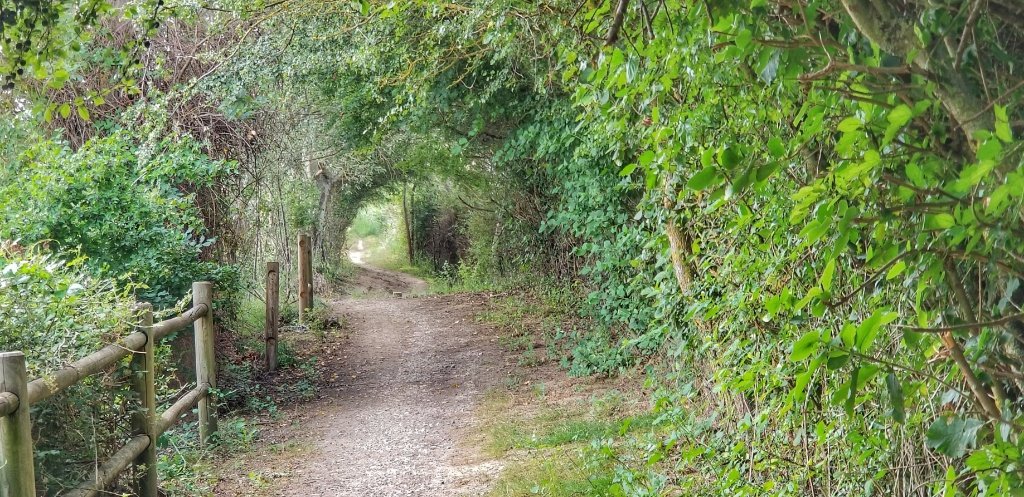 The track ended and we were directed into a shady grassy path, a tunnel of trees almost. We walked between two fields, one of corn and the other of beans. I wasn’t so keen on this path as there were puddles of water and I knew it would be the perfect place for critters who like to bite… so I picked up the pace. I was really happy to see the end of the ‘tunnel’ and it looked more open ahead. But actually we popped right out in front of the church. We had reached the end.