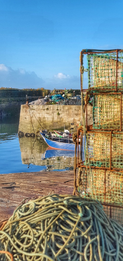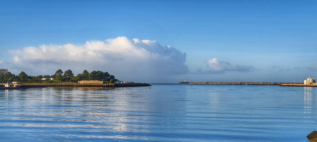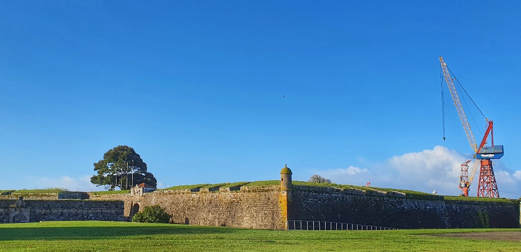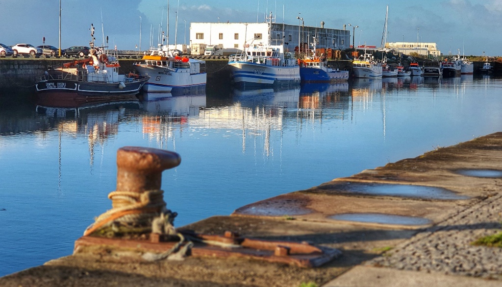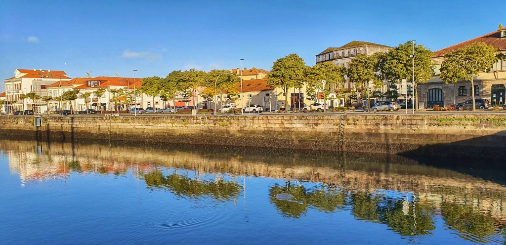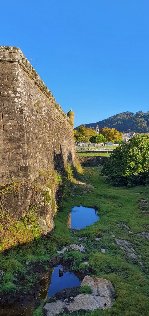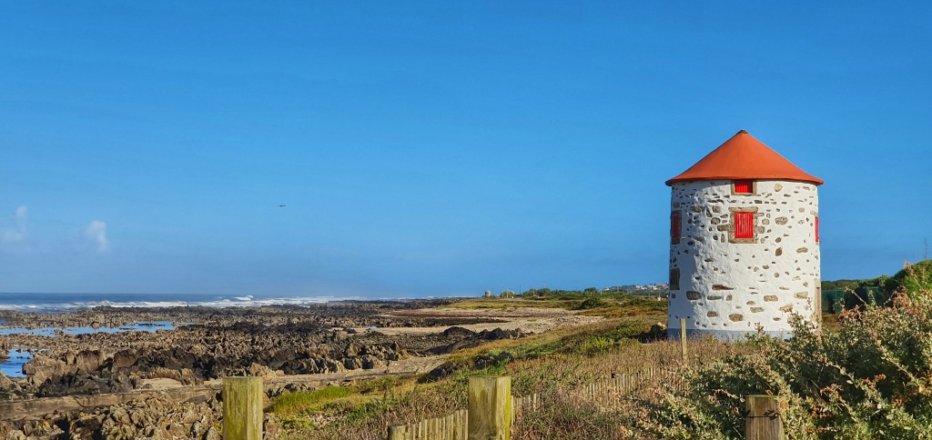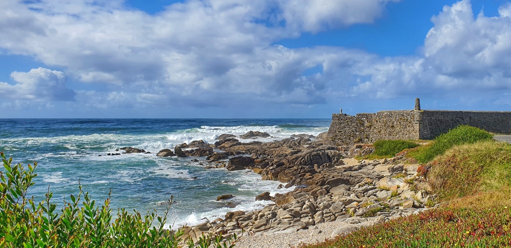 We only had 17km today so we dawdled. We meandered down to the waterfront, so calm after yesterday’s storm. Gerry searched for fish and I took photos of the reflections. We walked by fishing nets and fishermen and explored the aptly named Forte Santiago do Barra before heading back to the coast.