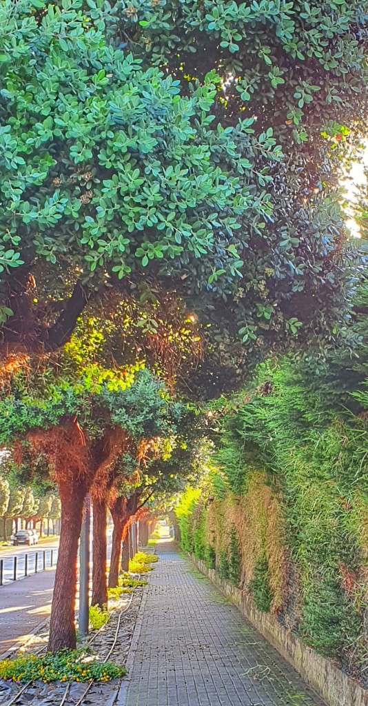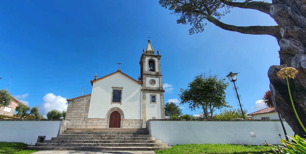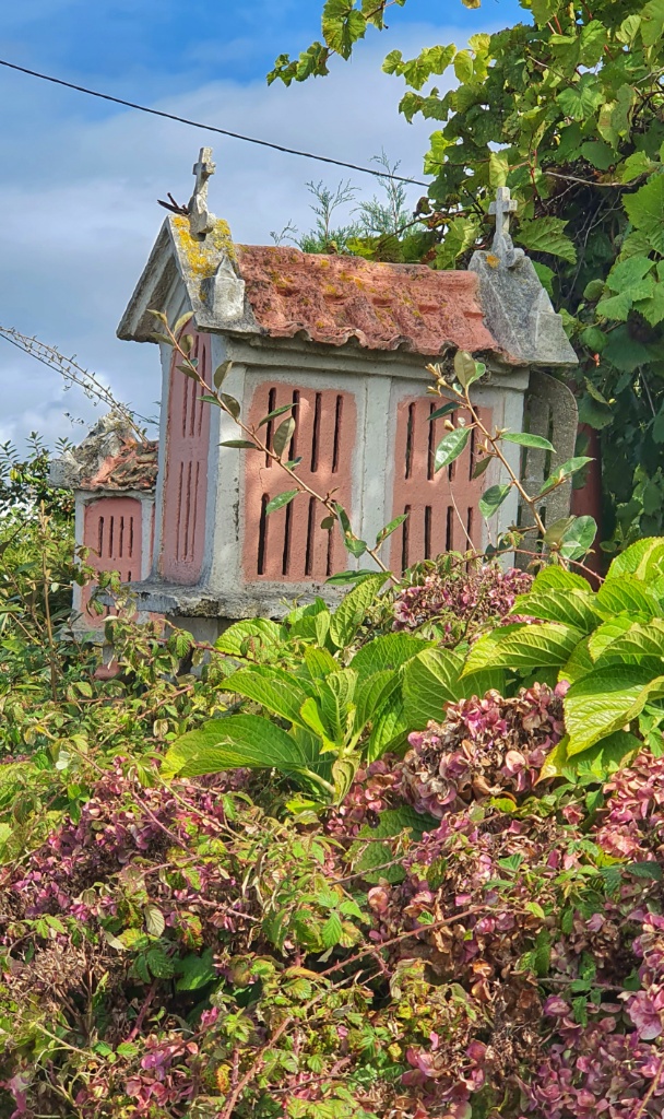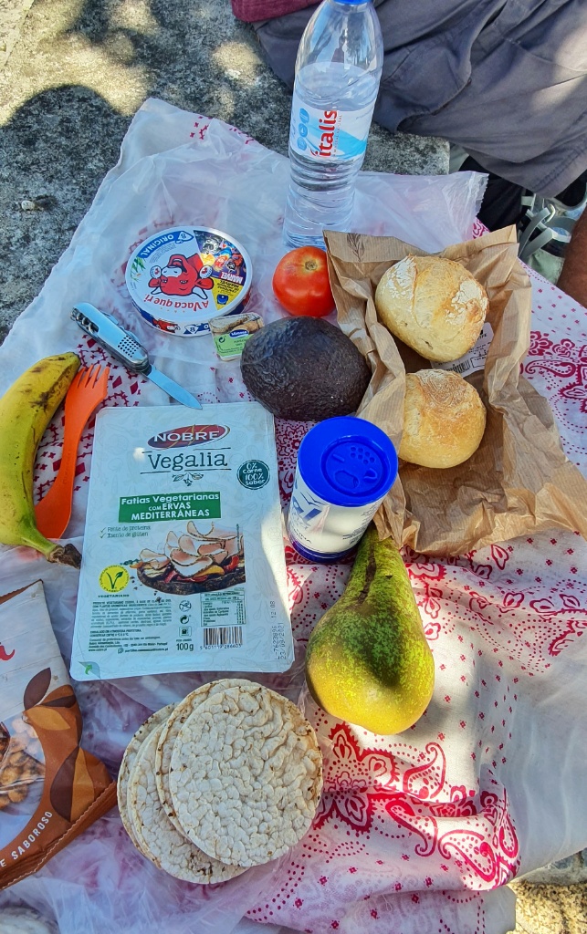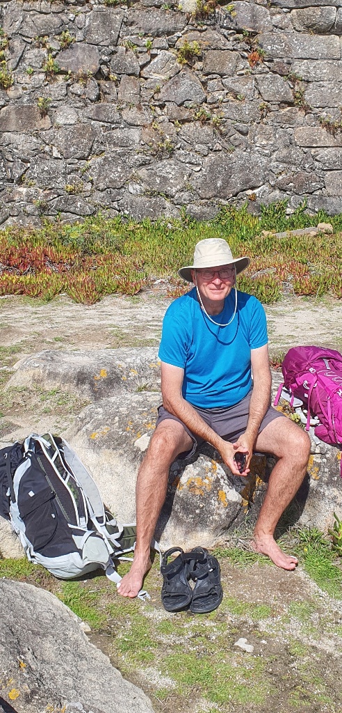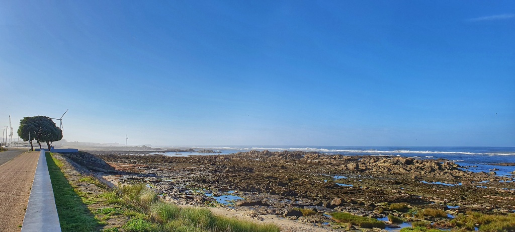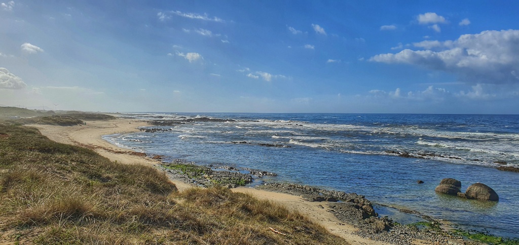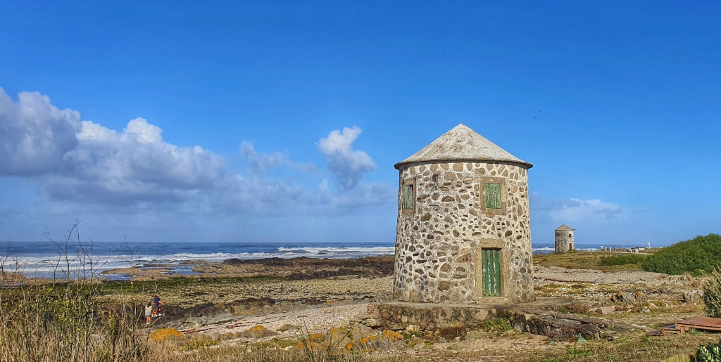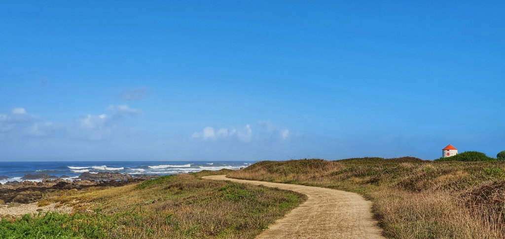 We reached our half way point. We weren’t sure which path to take. Go inland and join the Coastal or make our way along the coast using a GPS trail I’d downloaded. We stopped for a drink in Carreco and considered our options. The coast won. We set off heading back to the sea, following the trail in the Wise Pilgrim app. As we walked the skies darkened and we felt the first drops of rain. We reconsidered our options. We didn’t really want to be right on the beach if a storm rolled in but by now had walked quite a bit away from the Coastal route. We decided instead to plot our own route. We followed a track and then a small road into Afife. We bought a few supplies in a supermarket and headed for the church. There was always a seat by a church… Gerry’s bench requests are getting more complex everyday… quiet, nice view, not too low, in the shade and now cosy as well! I reminded him of the road we had to sit on when walking the Primitivo but he scoffed. To be fair the church did have a wall that made the perfect bench… in the shade, under an enormous tree, looking out to sea. The threatened rain never came or it blew in a different direction, so we sat and enjoyed our picnic and congratulated ourself on our choice.