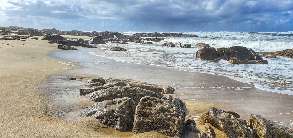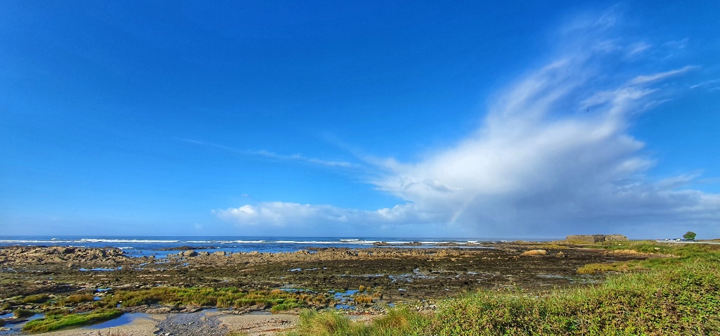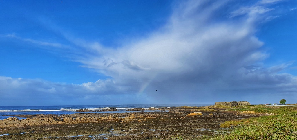 The sandy beaches were replaced today with rocky pools. As we walked we watched dark clouds form on the horizon and a faint rainbow appear over the dark sea. It was raining out there… we hoped it would stay there. We picked up our pace and wondered if we could out walk it.