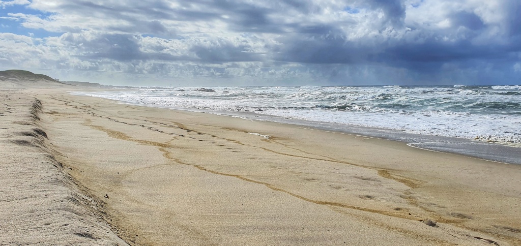 On we walked, sticking to the wet sand and then moving to a flatter part of the beach and dry sand. The last 4km were quite hard, sand walking isn’t as easy or as romantic as it sounded. We could see boardwalks on the dunes above us so we scrambled up to walk on those. Sadly due to works on the beach the boardwalk came to an abrupt end. There was nothing for it than to retrace our steps and head back to where we were. Getting down from the dunes was quite steep so the only way back to the beach with a pack was to run… it was actually good fun!