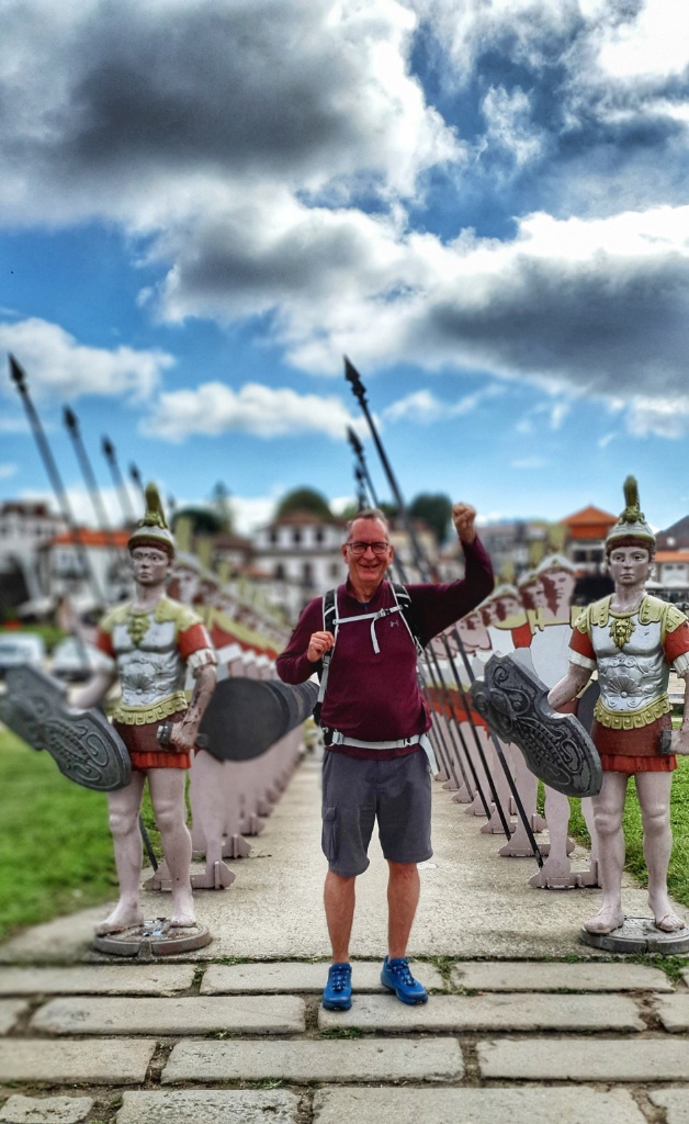 We proceeded to wander through the old streets of Ponte de Lima, climbed the steps to the city walls and wandered down to pose with the Roman legion and admire the bridge. The last time I was here I arrived in the dark and the rain so it was a joy to wander in the sunshine. We stopped for a drink, Gerry ordered a vino tinto and I asked for water; two wines arrived. Gerry said he blamed Jesus as it wasn’t the first time water turned to wine… I blamed his awful Portuguese.