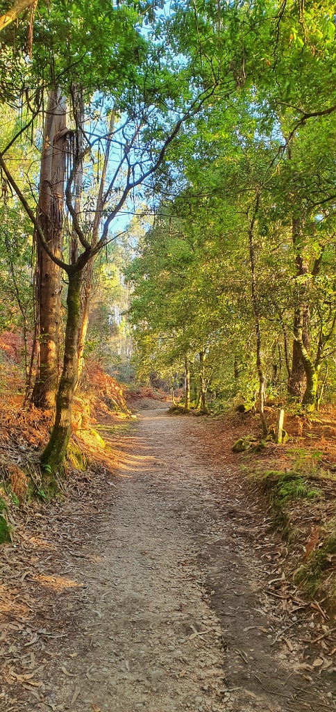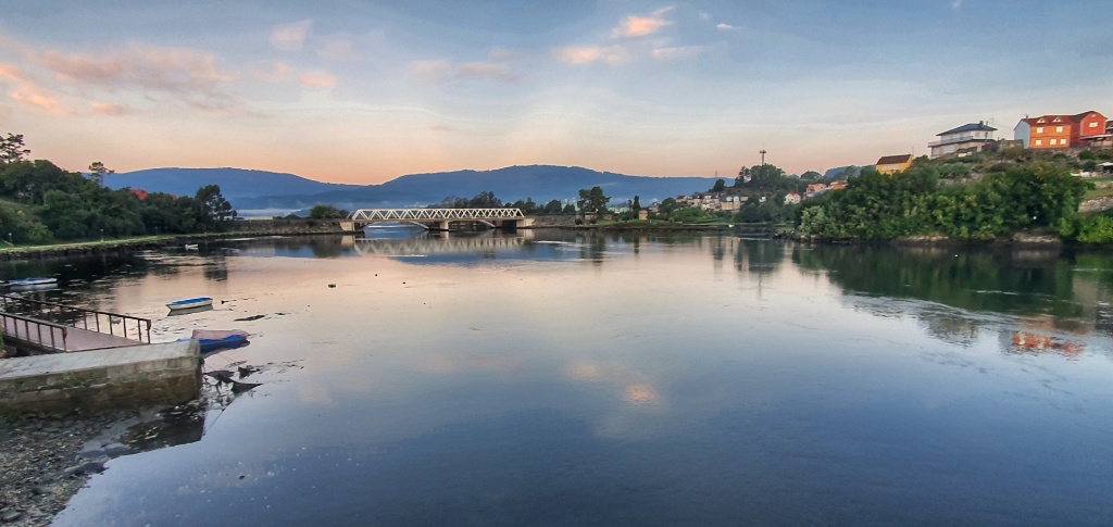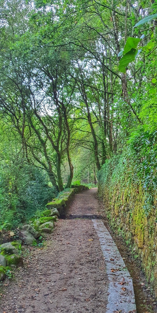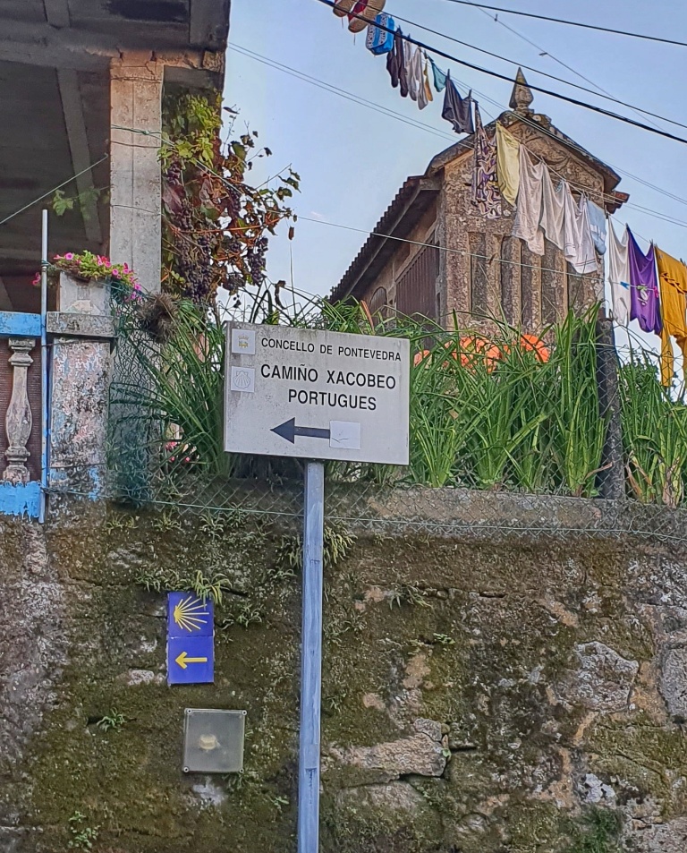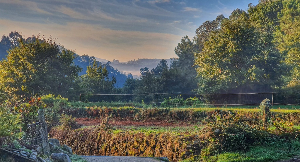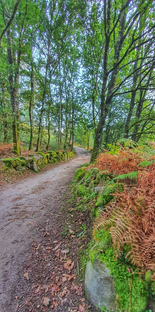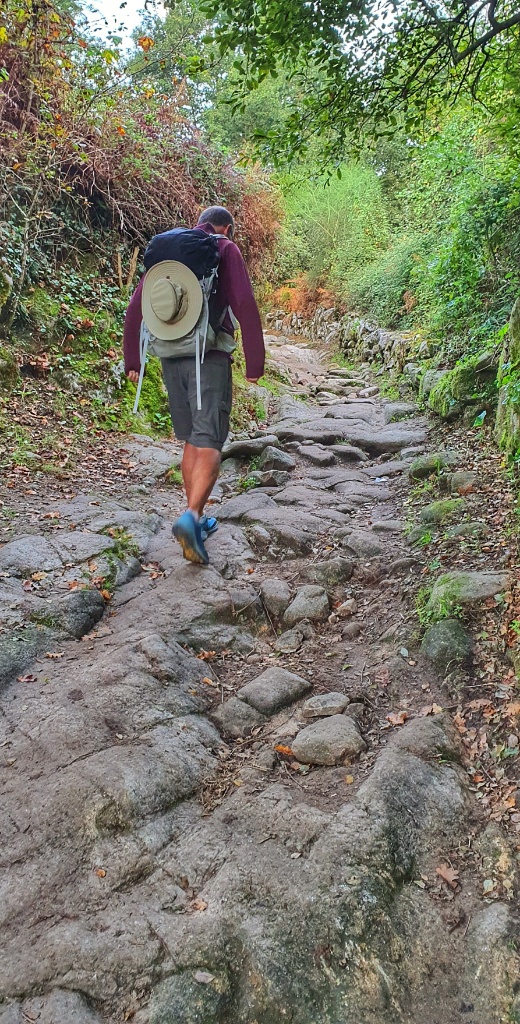 Onwards we headed, through the tiny narrow village streets and off into open countryside. I remember this walk from 2019. It had been glorious. The same apricot sky and cool morning air greeted me as I walked. Today autumn was far less advanced but Gerry took more pleasure in the stones under our feet. Since Ponte de Lima we’d seen reference to the Rua Hispanuca XIX… he’s been calling it the R19 for ages. Today we walked for many kilometers along the old stones and marvelled at the Roman engineering. We stopped for a break partway along and looked it up… it seems to have come up from Seville and Merida to Braga and was heading to Iria Flavia and Padron before diverting to Astorga. So many cities that I’ve walked through… so much history. But for us though we were heading to Pontevedra.
