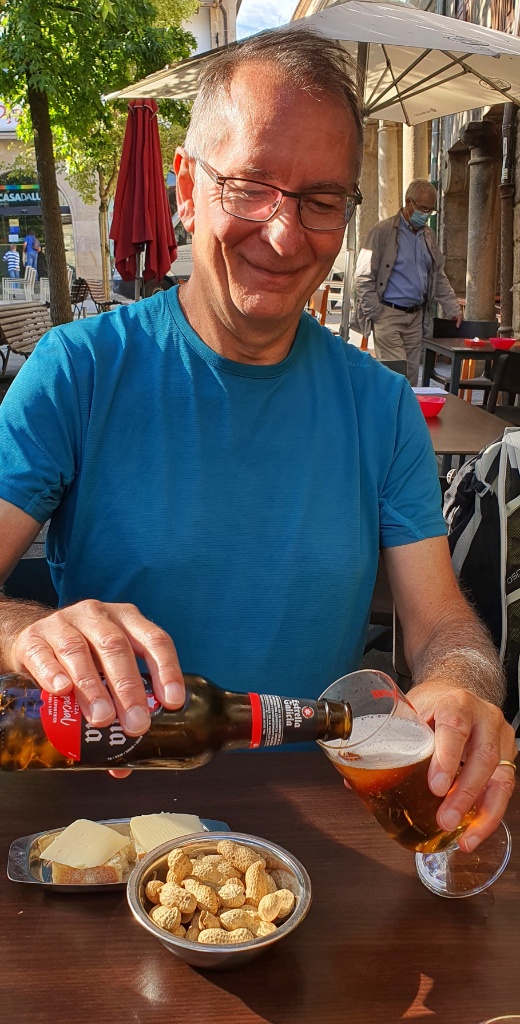 We made great time and reached town before midday. We had planned a simple lunch in the old town before heading off again. I knew just the spot but it’s hard navigating your way around an old town where all the narrow streets look the same. Gerry was about to lose patience with me and take command but luckily I found it… a pretty tree filled square full of little bars, cafes, restaurants and people. Today was market day so it was busy… and noisy with all the chatter and greetings. Everyone is wearing a mask but it really feels like life is returning to normal. It was good to sit in the dappled shade of a large maple tree and just watch the scene unfold. We ordered a ration of tortilla and some more padron peppers… and cold drinks. It was perfect. These last few days have been wonderful and our doubts about walking inland have long since disappeared. We ate and watched and chatted and made plans, drank coffee and just enjoyed the warm sunny Saturday feeling. But we had to go. We had a date to keep.