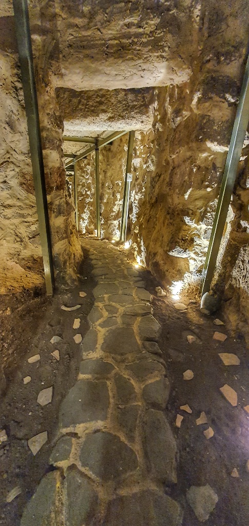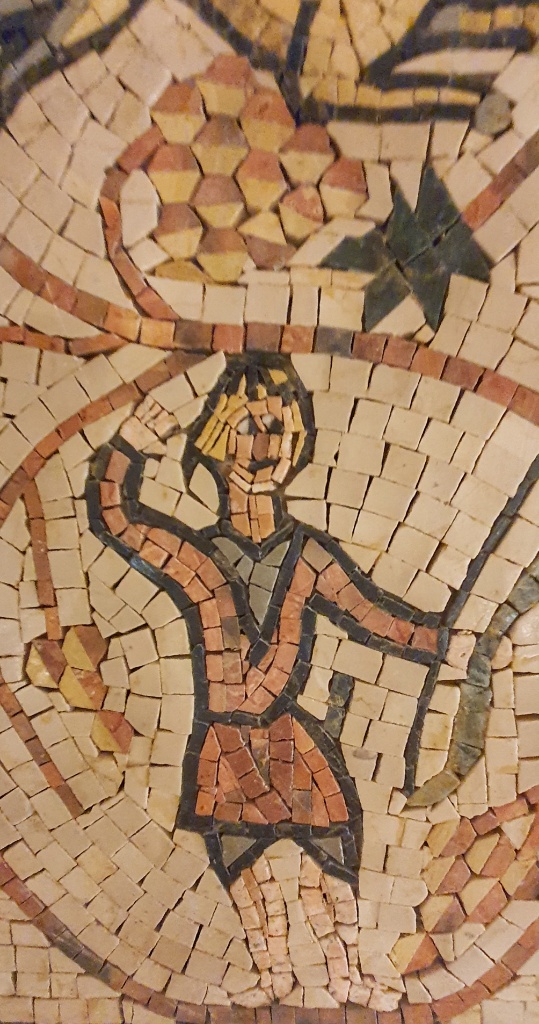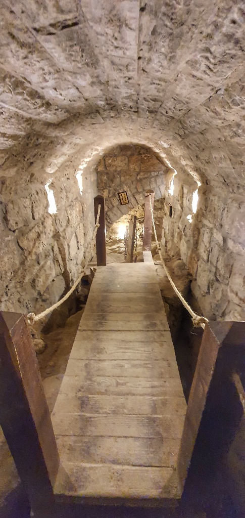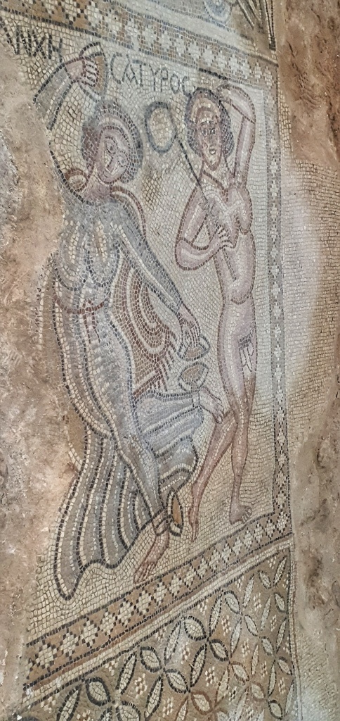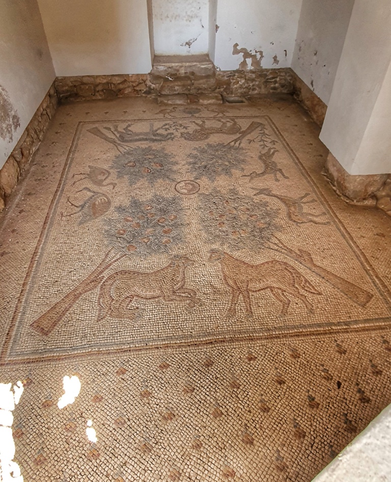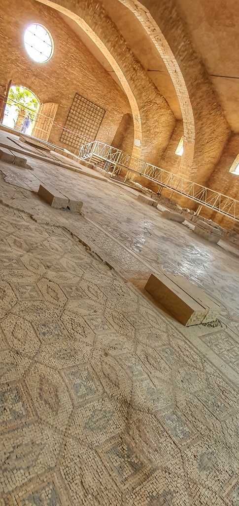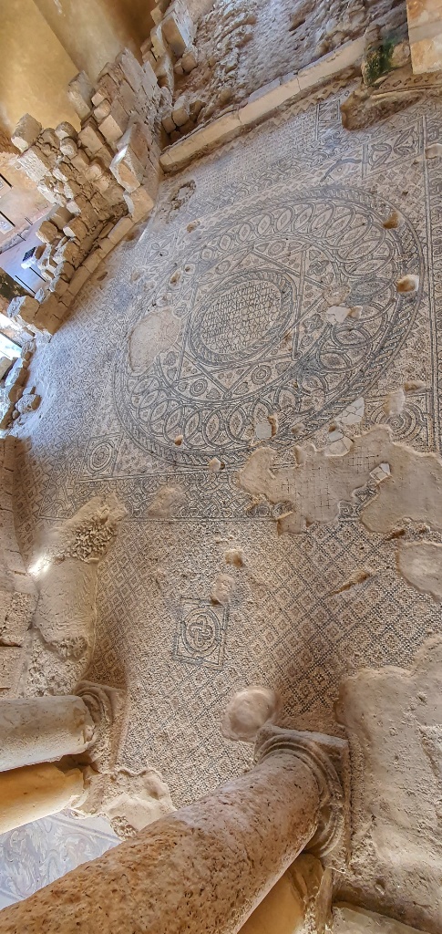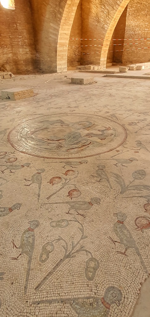 Under another church we found a series of tunnels, so low that you really had to crouch to get in. And above you could climb up to the Bell Tower… we started but the stairs became so narrow and so wobbly and high that we decided to forego the last few steps… and returned to the safety of the church below. We giggled like children at some of the mosiacs, it looked like folks we’re taking their Zebra and Emu for walks and in another the chap looks like he’s waving… I’ve no idea why we find this so funny… but sadly we did!