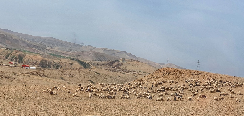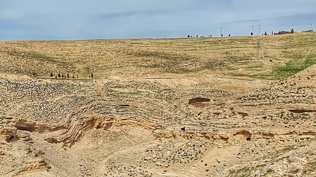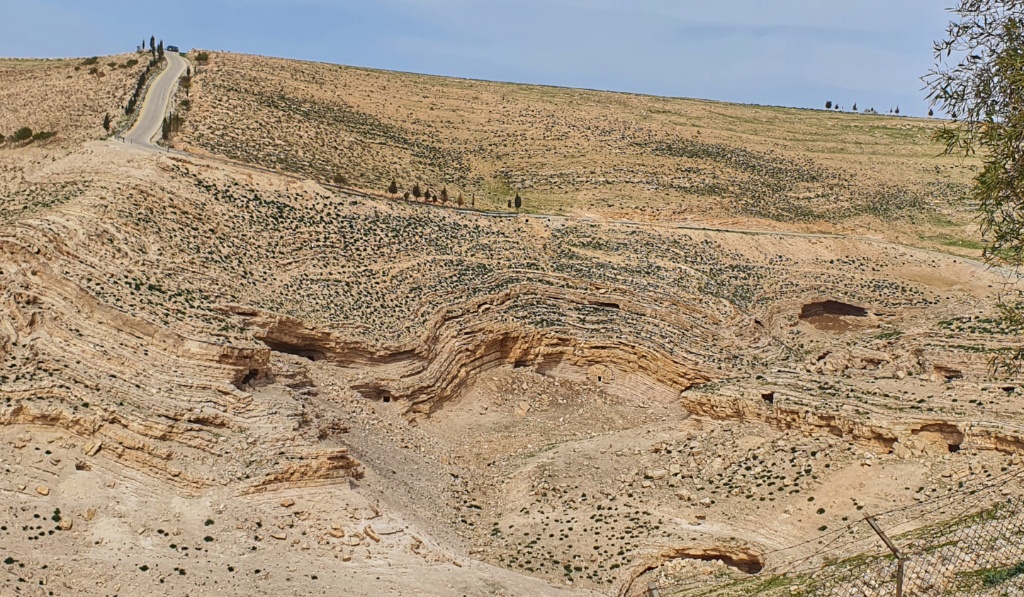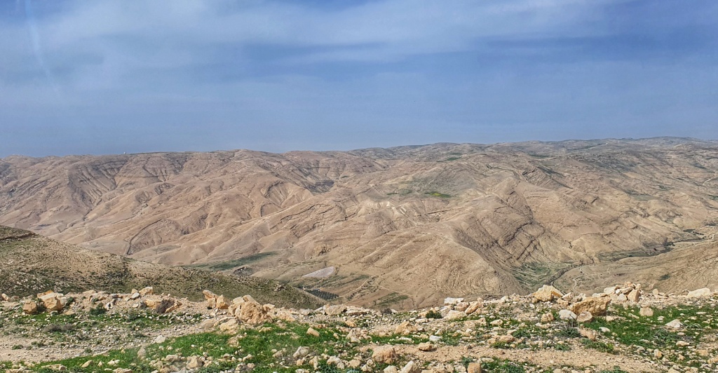 We drove out of the relative green valleys and hills of Madaba and returned to the more arid landscape we’d seen yesterday. Sadly when we arrived at the site it was closed for renovations so we could only gaze across at the remains of the hillside fortress in the distance. We were fascinated by the cave like constructions built into the hills. We’re on the opposite side of the Dead Sea from where the Dead Sea Scrolls were found and if that environment looks anything like this, we could well imagine how treasures would be lost and buried for millennia.