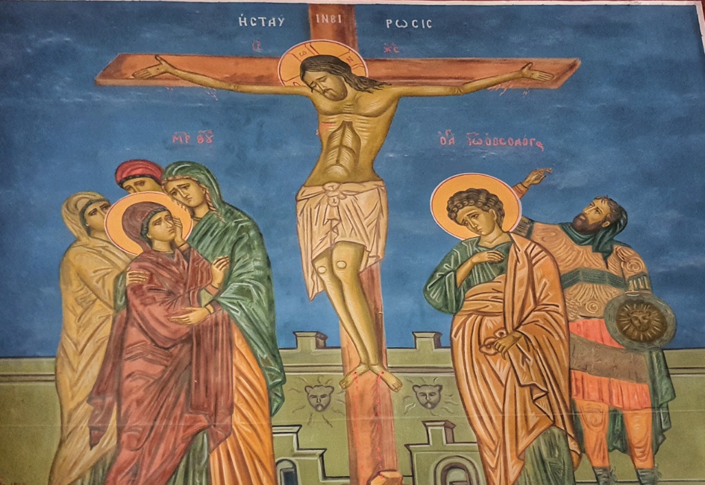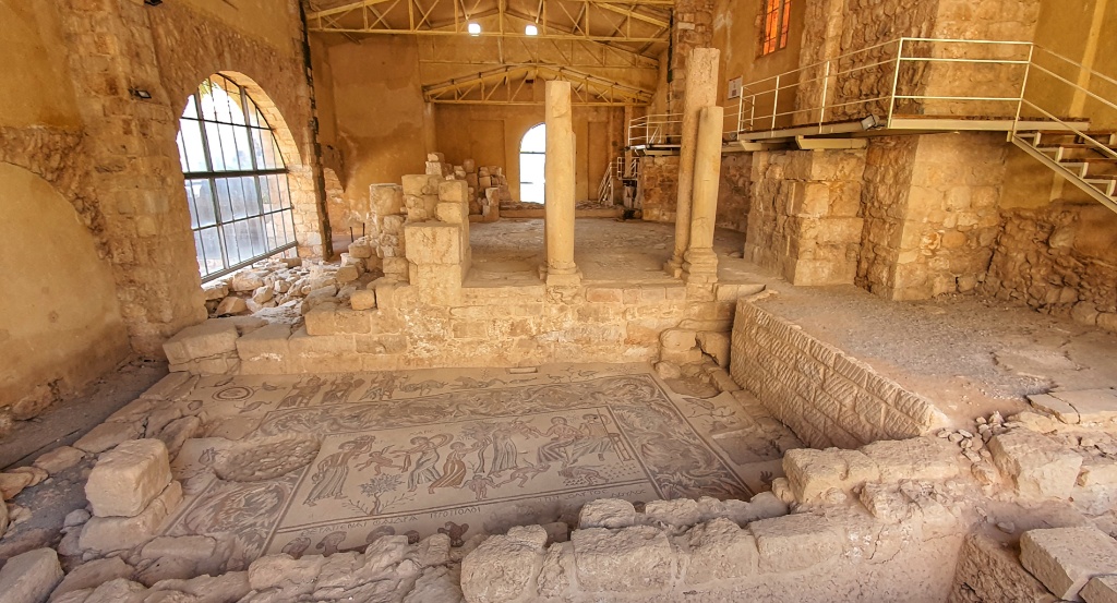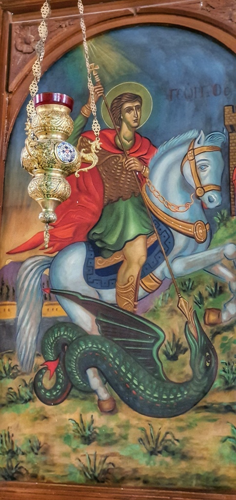 Madaba’s chief attraction, in the contemporary Greek Orthodox church of St. George, is a 6th-century Byzantine mosaic map showing the entire region from Jordan and Palestine in the north, to Egypt in the south. What was most striking to us was the depiction of the Jordan River, with boats sailing into the Dead Sea and bridges crossing from the East and West banks and large fish jumping out of the river; so very different from what we saw yesterday. The church was, like the Russian Orthodox Church yesterday, brightly painted with many murals of St George.