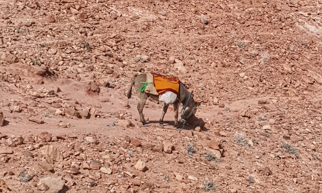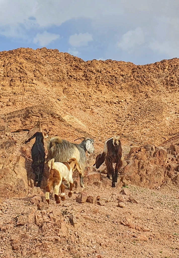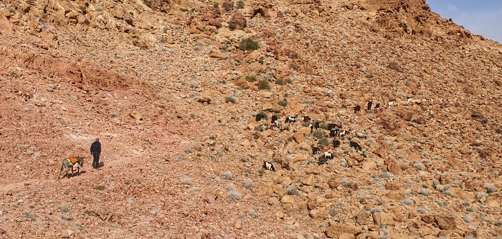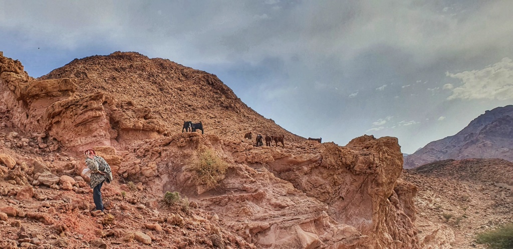 Our guide today was Ibrahim and he introduced us to a couple of his Bedouin friends, their donkey, goats and their dogs. Who’d have thought after yesterday’s struggles that today we’d be walking with shepherding dogs. But actually it helped me. The men explained that their dogs are not aggressive but it’s likely that one or two young female dogs had joined us, initially, thinking that they would be protected by us. It’s true that the first four dogs simply followed us and did nothing, they never even barked. But because we were then travelling with a pack of dogs, the sheep-herding dogs did what they should do… and moved us along. The two dogs that really stirred things up later were probably males, trying to mate. The Bedouins reassured us that the dogs were never interested in us… if they had wanted to harm us they could have and would have… but we just got caught up in their squabbles. What they said made sense, it was true that as scary as it was the dogs never tried to attack us… and the four who followed us never made a sound and kept a distance. It all made sense. I’m glad they explained it and thankfully no harm was done and in spite of the dogs, or maybe because of the dogs, yesterday was magnificent.