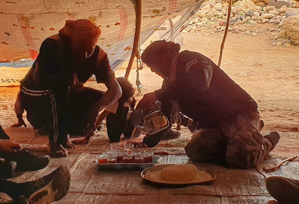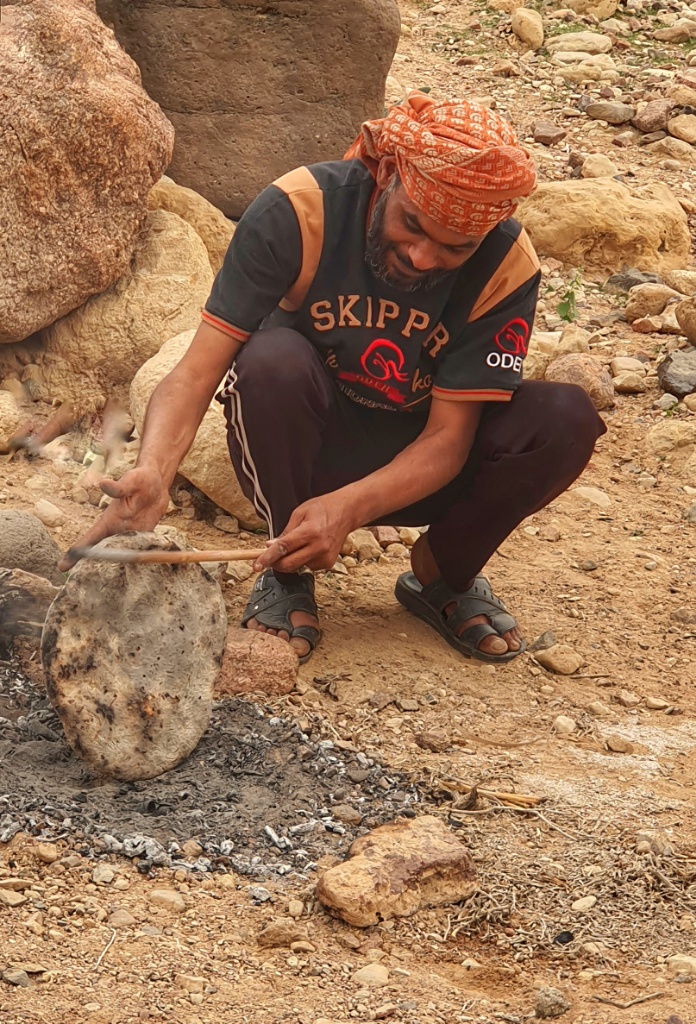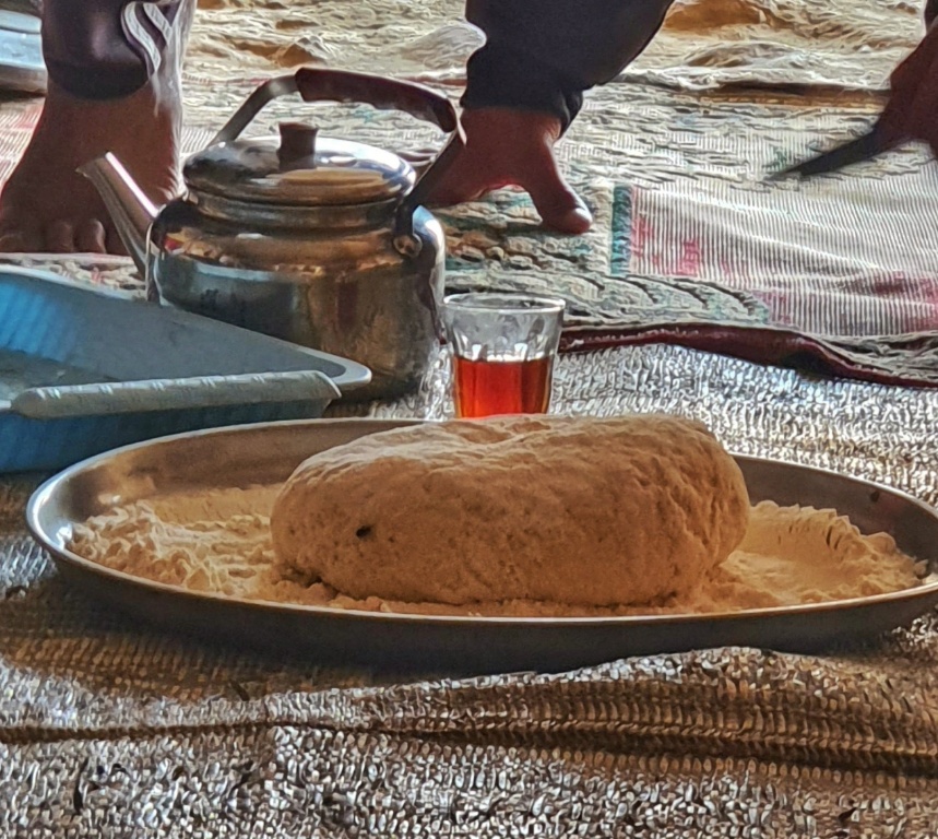 At the camp, we were led into one large tent. The owner was a widow but she lived next to her son, and he was going to make the bread. It’s usually a woman’s job but we don’t get to see the women of the house. With flour and a little salt, our host mixed water and kneaded his dough and shaped it. Whilst it proved, he and his children serve sweet tea for everyone. After our tea we all headed outside where a fire had been lit and once the embers are hot the bread was placed on the hot earth and covered with sand and ash.