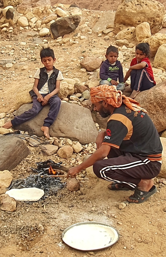 We returned to Feynan and lunch had been prepared. In the afternoon we had yet more adventures planned with a walk to the local Bedouin village to learn how to make their flatbread; no good for me but Gerry fancies a bit of breadmaking when he’s retired.