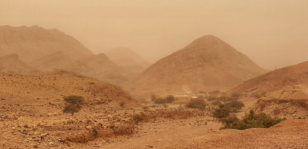 What surprised us was, when we entered the tent the sky had been bright blue but 30 minutes later after our team the sun was gone and a pale orange hue has settled everywhere. The hills and mountains that we had walked this morning had been swallowed up by the dust and the air was heavy and humid; there will be no star gazing tonight!