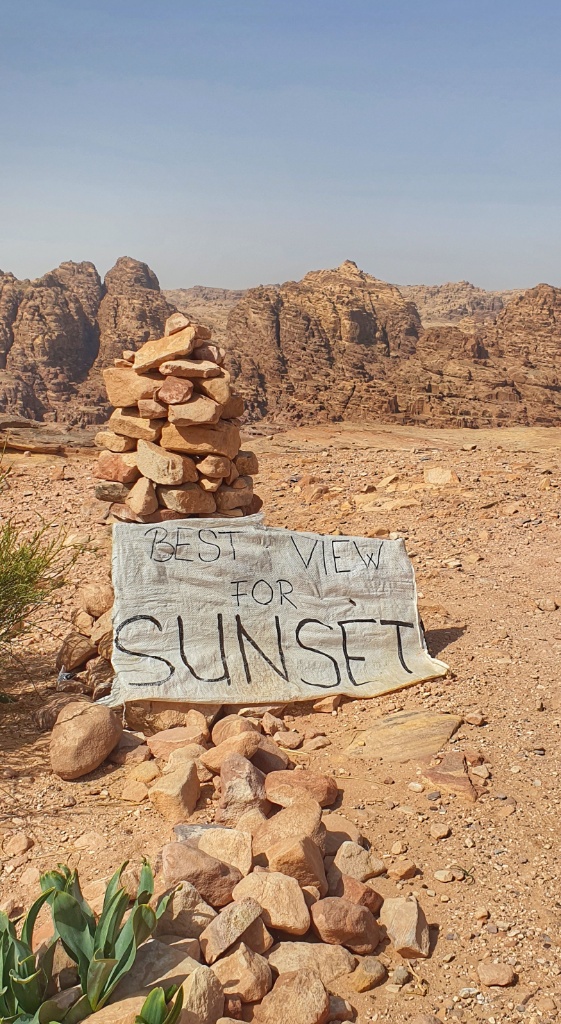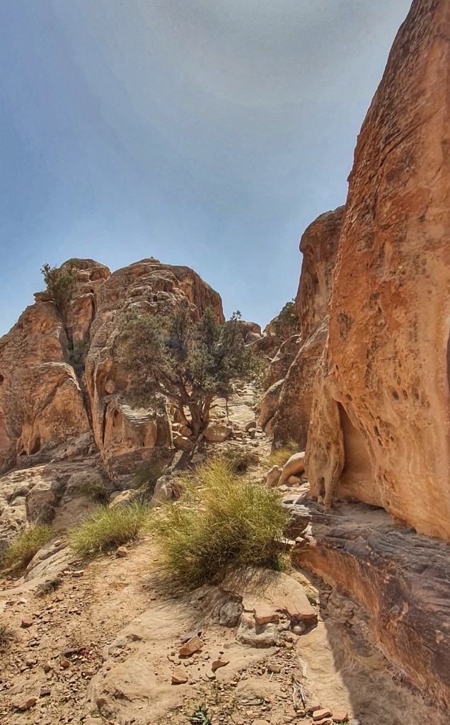 As we drank our water a young chap from Leeds came strolling down from behind us. He was as cool as a cucumber and he told us the way that he’d come and that we could follow his tracks up and onwards and out of these ledges. He continued on scrambling over the boulders and more ledges like a mountain goat!! I honestly believe this was some of the hardest terrain that I’ve walked. Modesty and politeness went out the window and Yusuf at first hauled me up the big rocks by offering a hand but later also pushed me up from my bum too, this was just not a time to care. All we wanted to was to get out safely and find some shade. Oh my we scrambled and we climbed and we pushed and we shoved and finally and unbelievably we spotted a little Bedouin café yeah! we were back on the trail. Happy happy days.