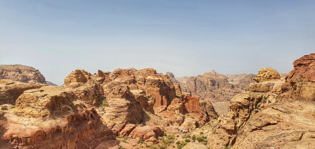 We stopped for a drink. It was really hot. We heard voices from afar and we realised that we were high above the Treasury. Not at the lookouts where the Bedouin take tourists but much higher. So much higher that we were looking down at those high Bedouin lookouts. The tourists below looked like ants. We were really unsure about where to go next. Everywhere looked a bit precarious but we knew 100% that we weren’t able to go backwards.