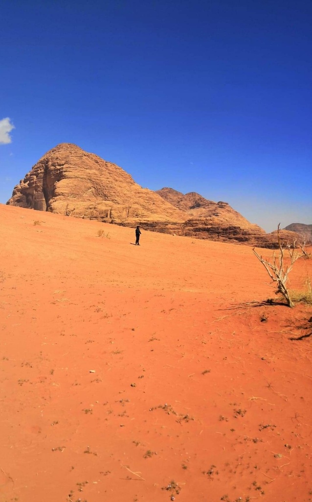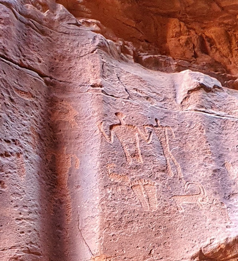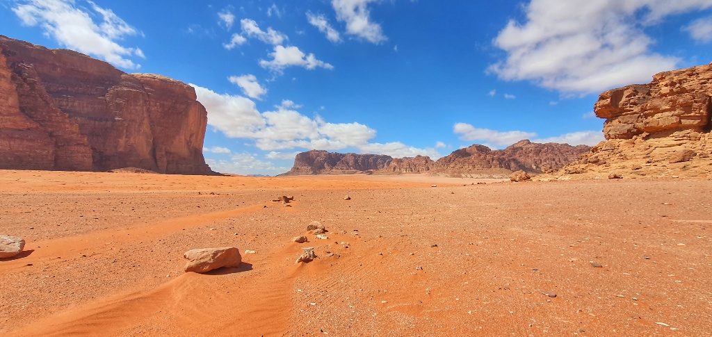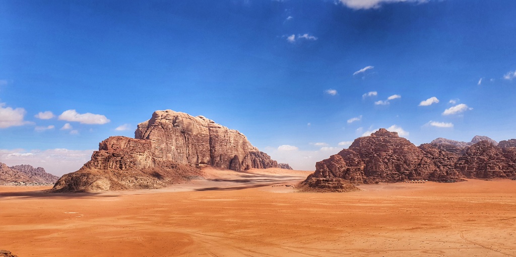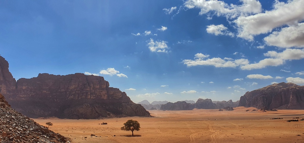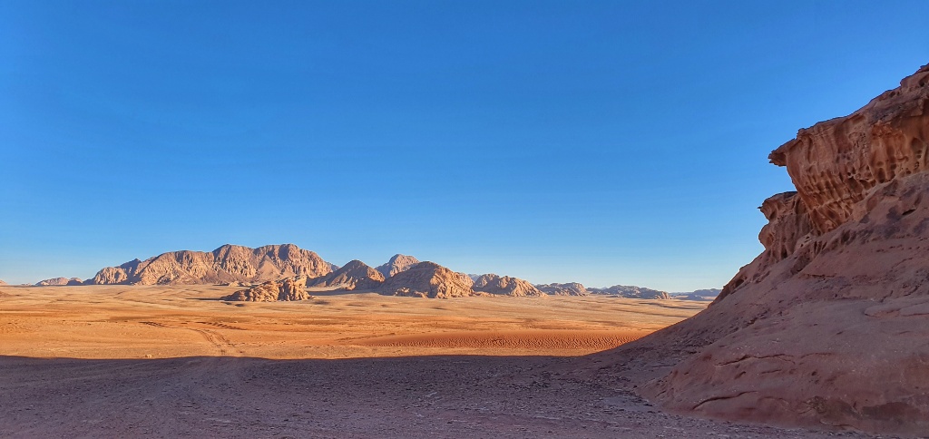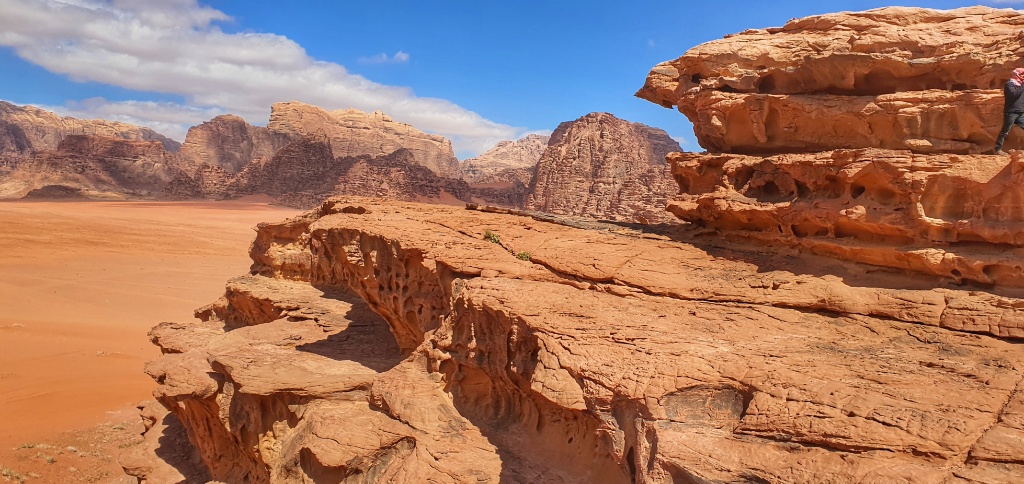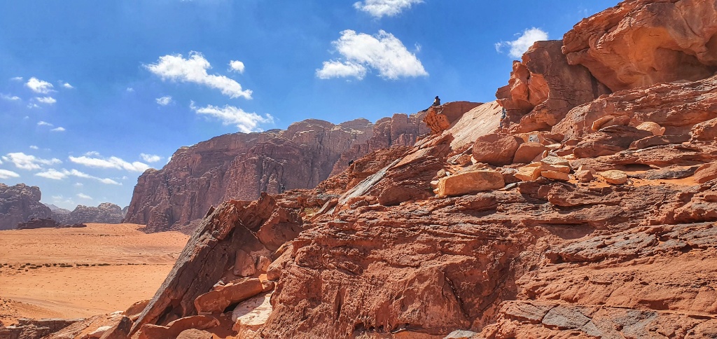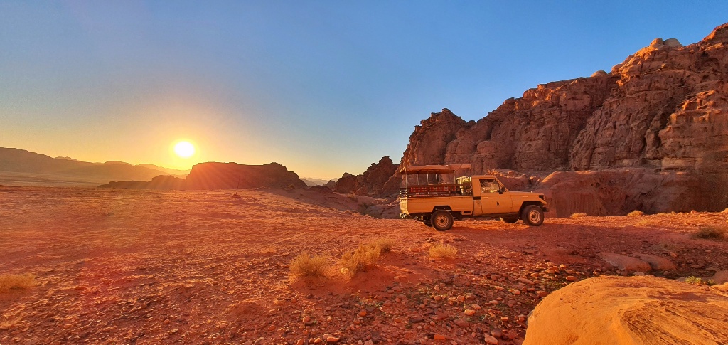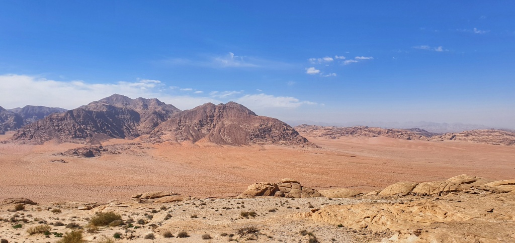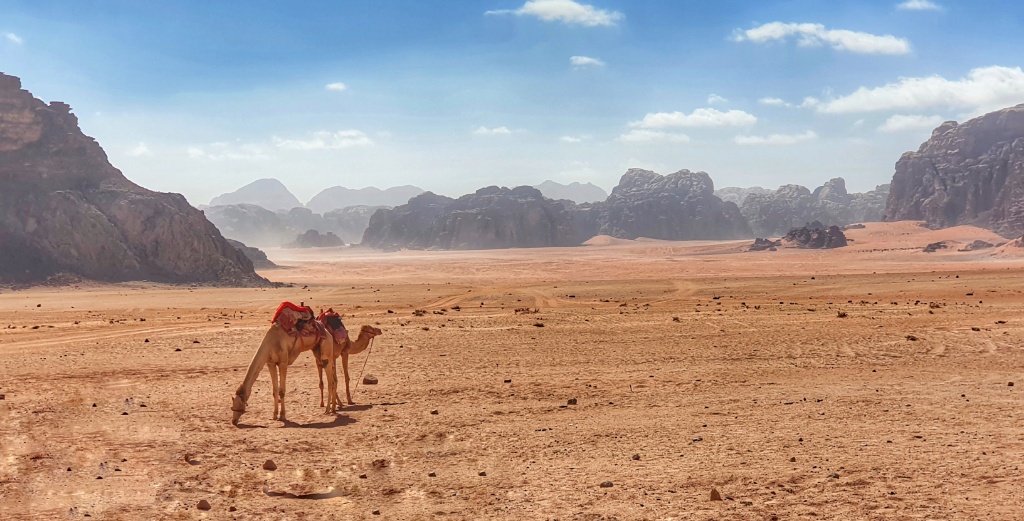 Wadi Rum is a protected area covering 720 square kilometers of dramatic desert wilderness in the south of Jordan. Huge mountains of sandstone emerge from the desert, reaching heights of 1800 meters. We were going discover these and so much more. Narrow canyons and fissures cut deep into the mountains concealing ancient rock drawings etched by the peoples of the desert over millennia.