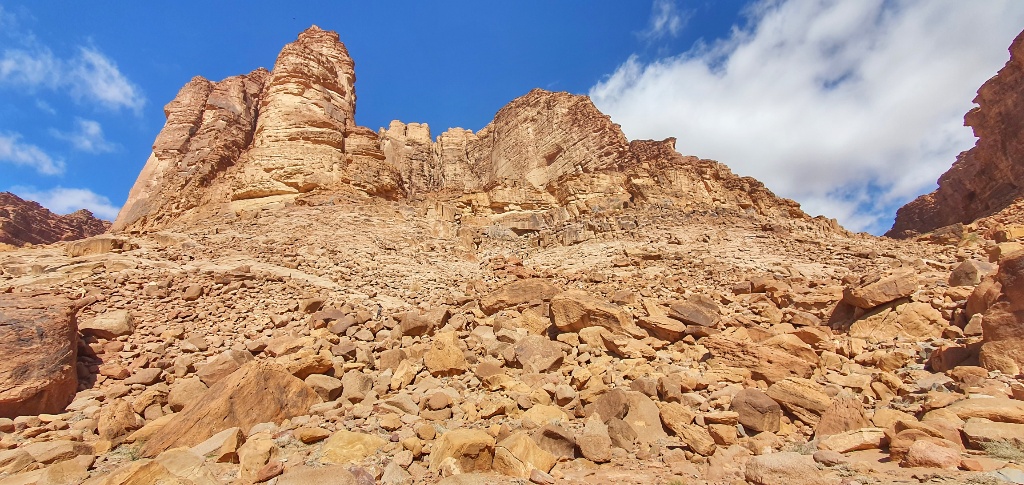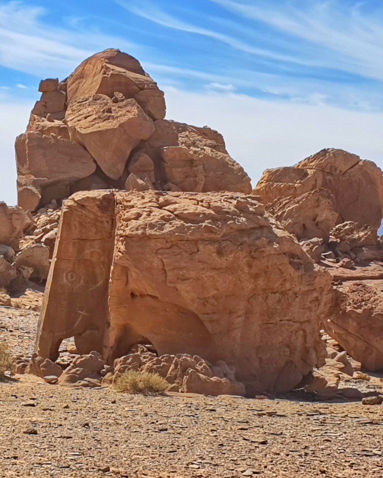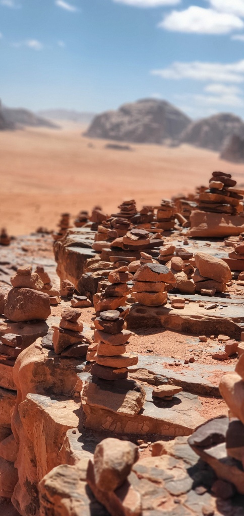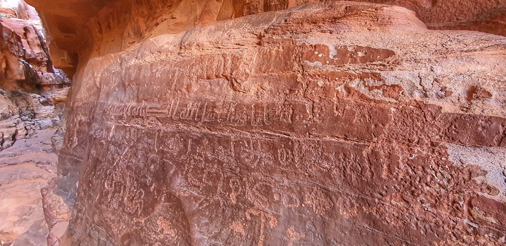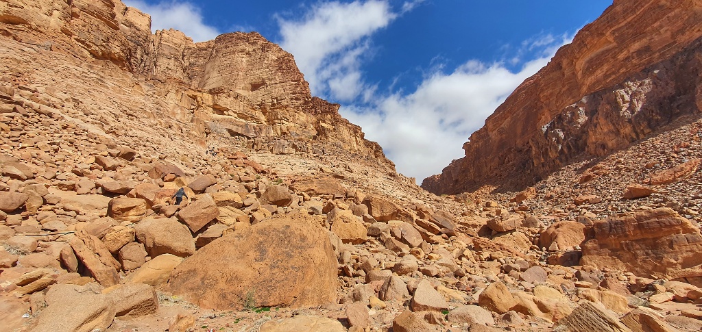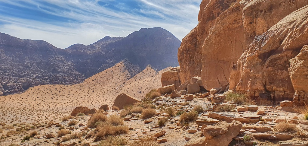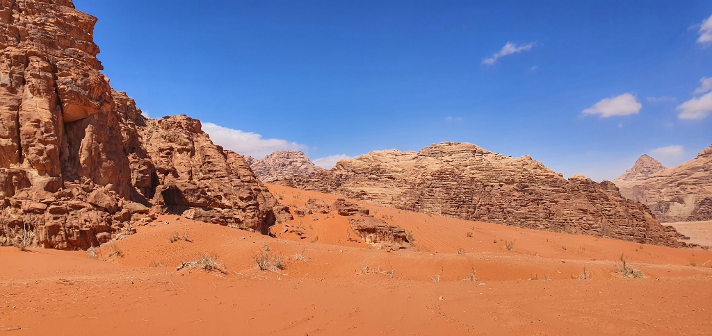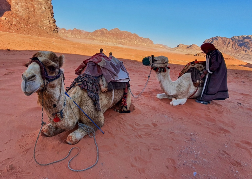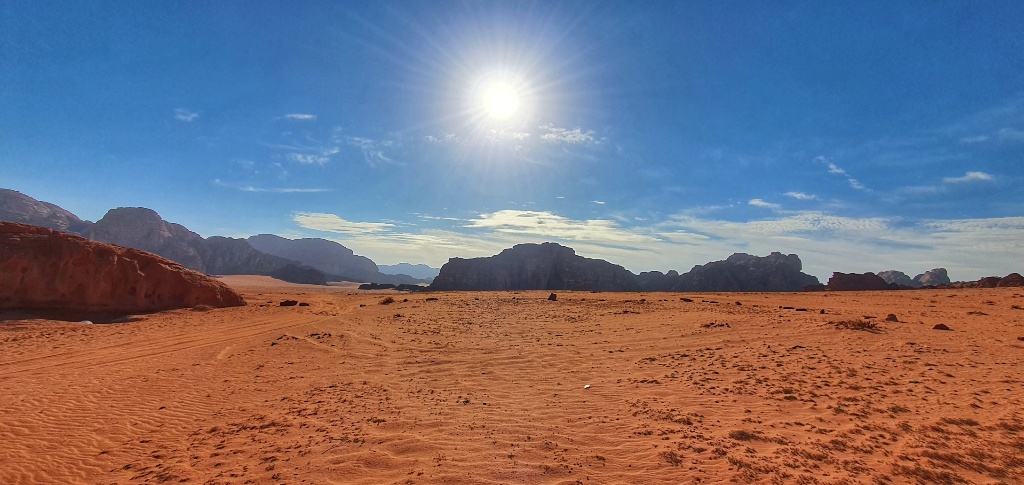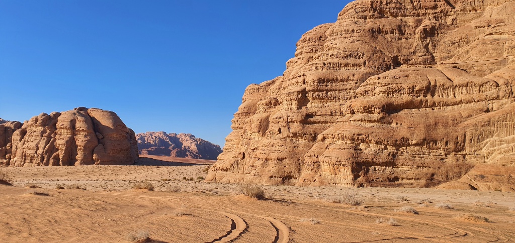 Wadi Rum is a protected area covering 720 square kilometers of dramatic desert wilderness in the south of Jordan. Huge mountains of sandstone emerge from the desert, reaching heights of 1800 meters. We were going discover these and so much more. Narrow canyons and fissures cut deep into the mountains concealing ancient rock drawings etched by the peoples of the desert over millennia.