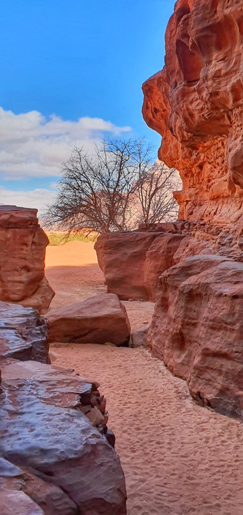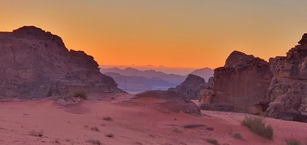 We first drove to Lawrence Spring, it was a bit of a climb and partway up we both decided we didn’t actually need to see the spring and instead sat on the giant rocks and admired the view. After this we travelled onwards, pausing to scramble up giant dunes or walk through enormous gorges. Nawaf showed us the Nabataean cave drawings and early Arab inscriptions and showed us where we could find water year round in the desert. He showed us herbs and explained why the fig tree was white and why it lost its leaves but still bore fruit. He made us tea and cooked us lunch and told us about Bedouin life. He kept us busy all day long and finally, after a full day of exploring, we paused to watch the sunset over the mountains.