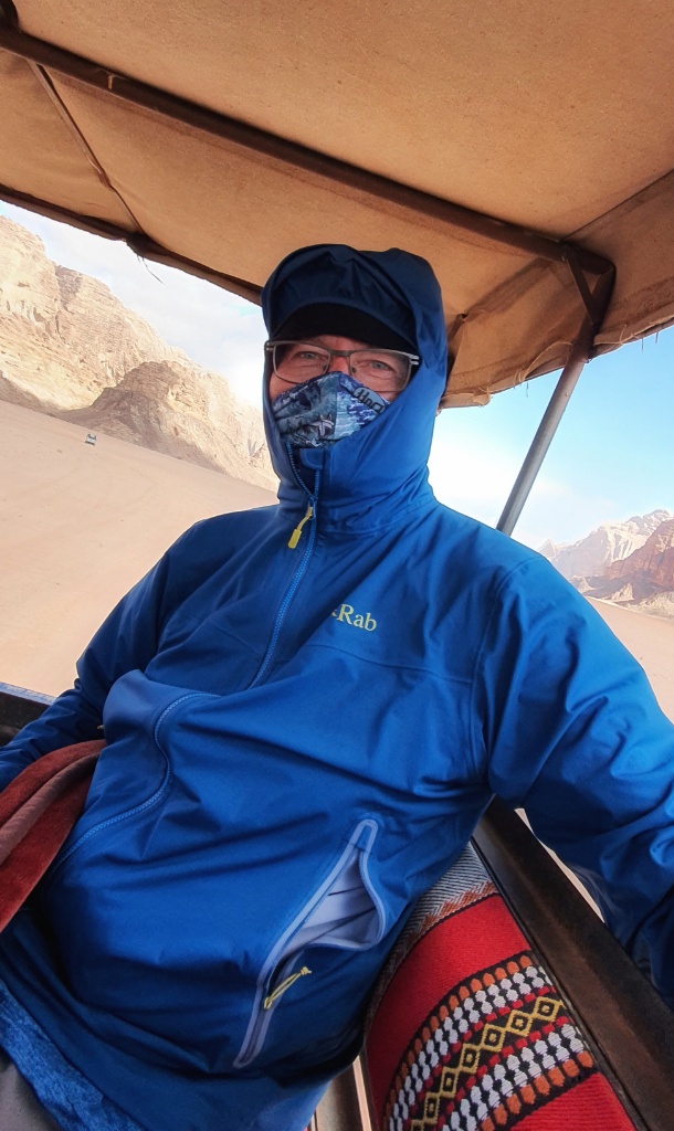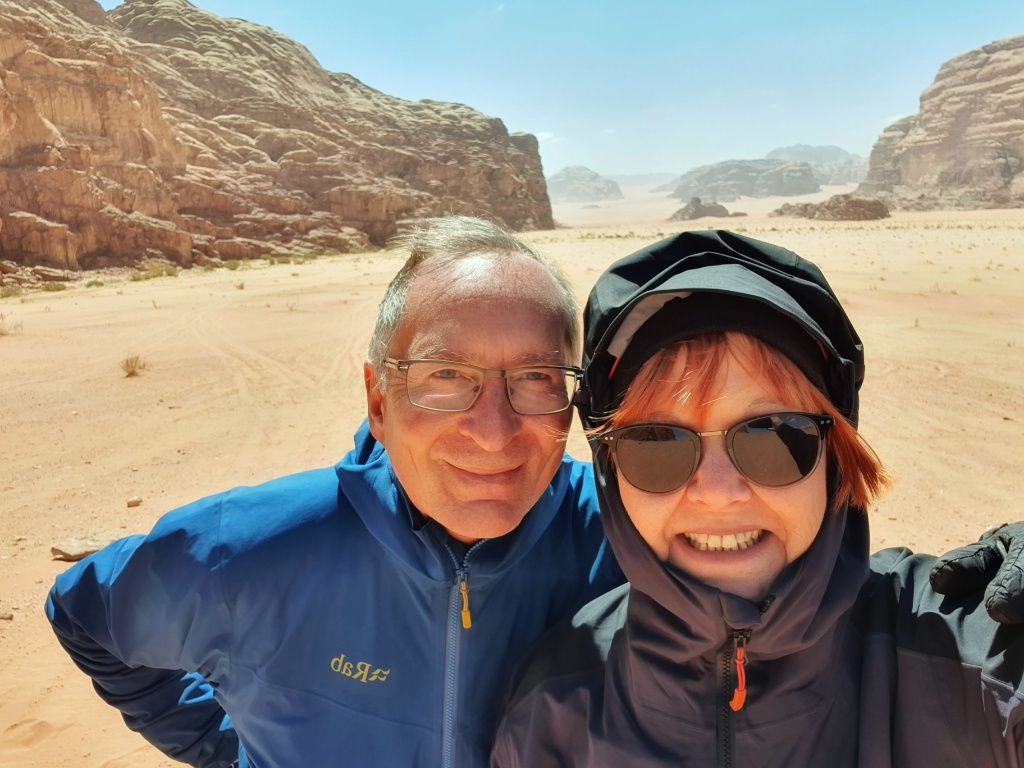 We left Petra at first light, sharing a taxi with Lotte from Denmark who was going to be our travelling companion for the next few days. There had been a change in weather at Petra and our third day of adventures was lost to the weather. Sadly we never got to hike to Little Petra, nor the Monastery nor Aaron’s tomb; I guess it will have to wait for our next visit! The bright sunshine of the previous day had been replaced with ice, high winds and snow! All night the wind howled and we wondered if the roof of the hotel may actually blow off! As we left on the second morning of the storm we really hoped that the wind would be gone by the time we reached Wadi Rum.