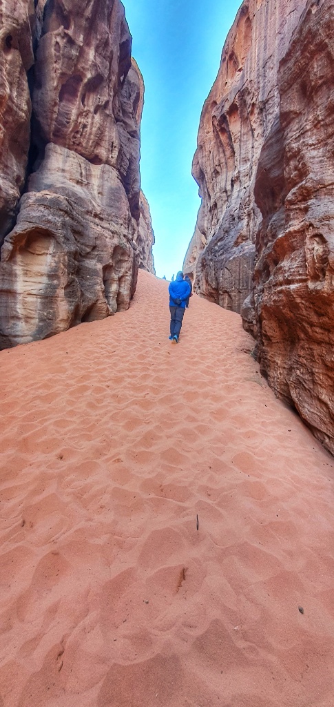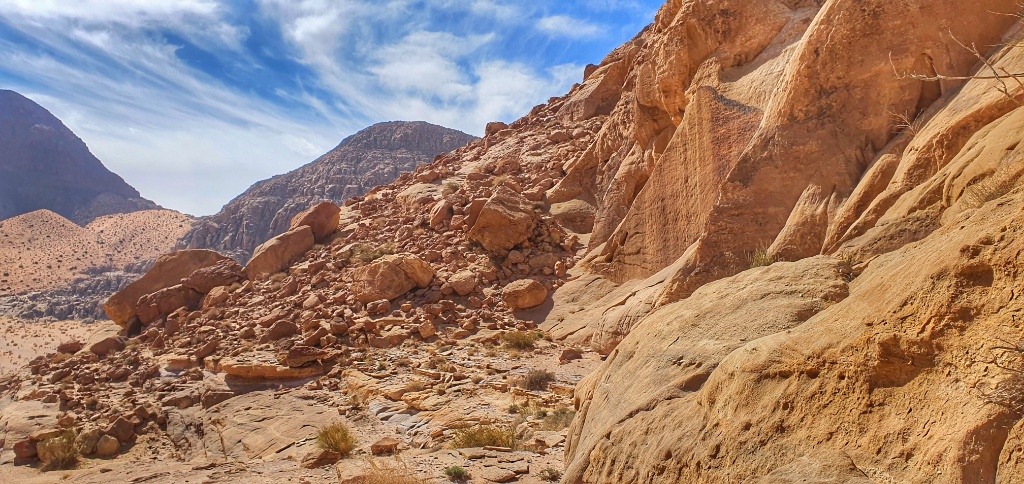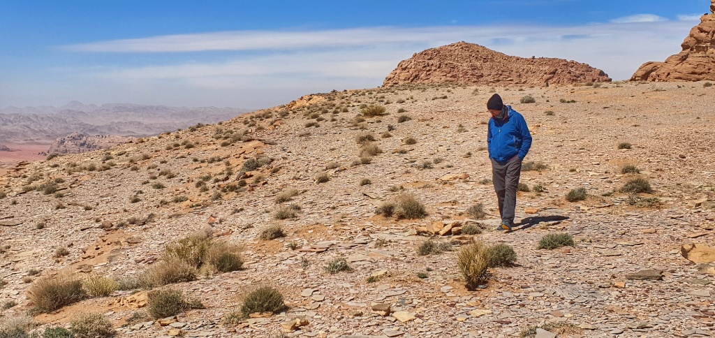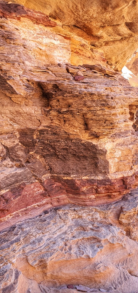 We drove to the far reaches of Wadi Rum. We were going to hike the Soft Mountain, Jabal Al-Hash… so named after the soft sandstone. Today was very different than yesterday, it was just us, Lottie and Nawaf for the most part. We drove for an hour and then hiked for a few more. We walked up and up but it was slow and steady. All the while our guide told us about his childhood in the mountains and stories of his grandfather. He showed us rock formations, the array of coloured stone, fossils and even a rock that he thought looked like an elephant… although he’d drawn a happy face on it to ensure we could also see it.
