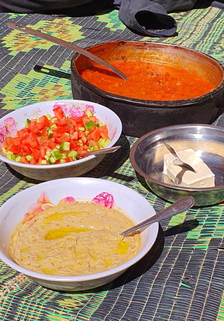 We’d been too cold to undress last night and I have to be honest it was too cold to shower in the morning! We woke at 7 and made a quick dash to the camp bathroom; the facilities were immaculate but gosh it was cold. We had a Bedouin breakfast with our hosts before setting off again into the desert. The wind had died down overnight, so whilst the air was still cold the sun felt even hotter today but regardless I was keeping my 5 layers on and we took two huge blankets in the truck for added warmth.