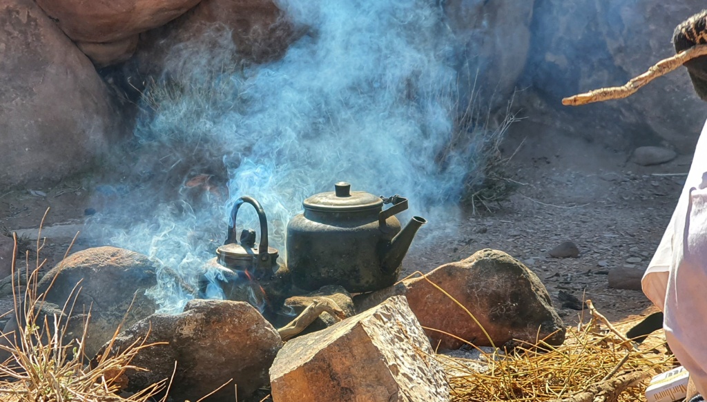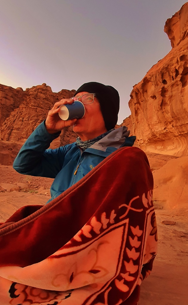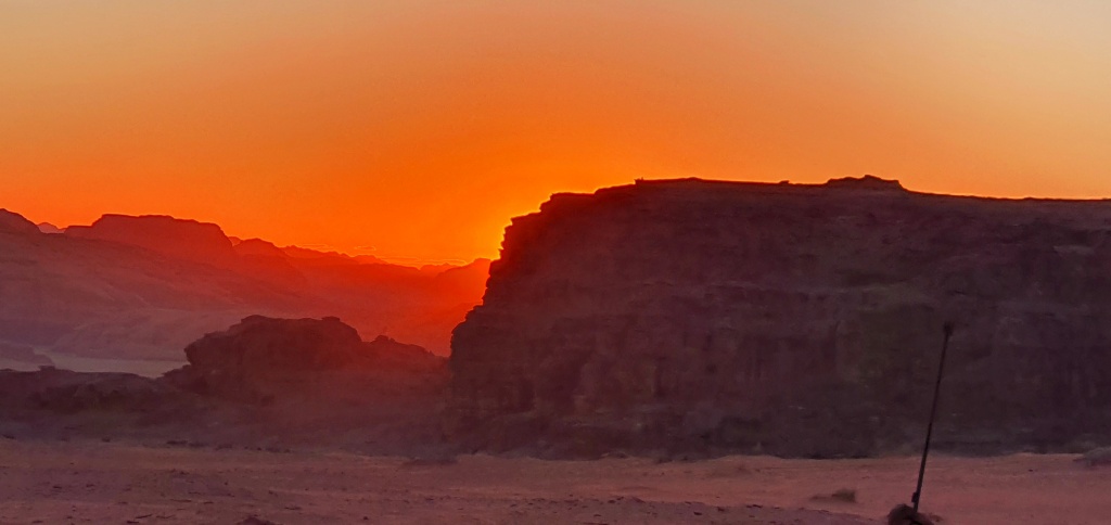 As with yesterday Nawaf made us hot tea and later made us lunch. It was so hot at lunchtime that we had to move into the shade. And after we’d eaten there were more tales of Bedouin life. We drove back towards the camp, stopping off at a huge underground water source, a dam if you like, that trapped water from the surrounding hills and stored it underground for passing herds in summer. We visited more odd rock formations and tried to throw stones into a hole high up on the cliff, like some crazy fairground game. We laughed at Nawaf’s jokes and talked and walked and climbed some more before returning to our sunset rock to watch today’s very hot sun set.