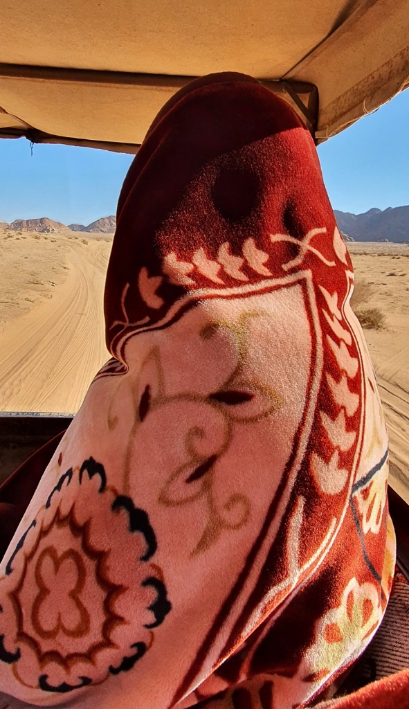 We arrived before 9.00 am and it seemed that the cold wind had indeed followed us. The three of us met our guide Nawaf and we set off into the desert in his old Toyota Land Cruiser. We sat in the back and whilst this offered spectacular views it’s open to the elements and OMG it was cold.