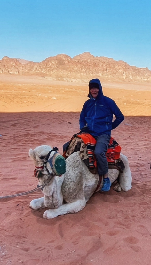 We made ready for our morning when Nawaf told us our lift had arrived and he also pointed out the white frost that had formed in pockets in the tyre tracks in the sand. We bid farewell to Lotte and our hosts and climbed aboard our camels for the 2 hour long journey back to Wadi Rum village.