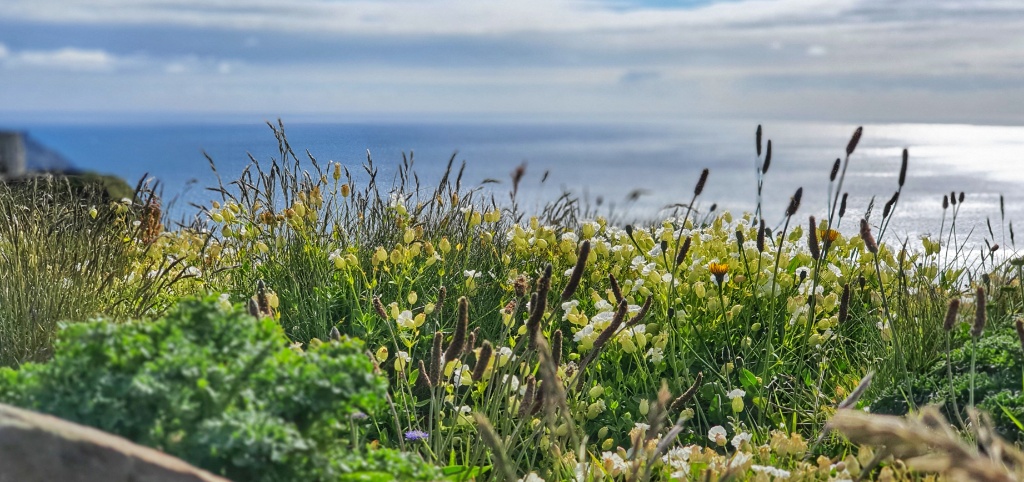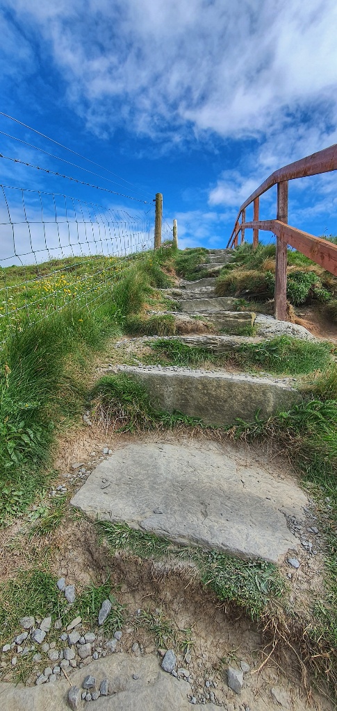 We followed the crowds up to the main footpaths. The trail around the main visitor areas is very good. It’s paved and fenced and very safe, indeed it would be suitable for anyone, including wheelchairs. We walked along these paths stopping to view the wildlife, the birds, the flowers and of course the amazing views. After a while the main path peters out and becomes a little more rugged and the fences that protect you from the cliff edge also stop. Most folks stop here but we of course continued. The trail wasn’t dangerous in anyway but it wasn’t suitable for tourists just out for a sightseeing stroll. The crowds disappeared and for the most part it was just us and the view and the cows. We walked on and on and came to a section with lots of very old steps. Lots of steps. If there were any remaining walkers it was here that most folks turned around. But of course not us. We continued on and on and gosh it was a beautiful hike.