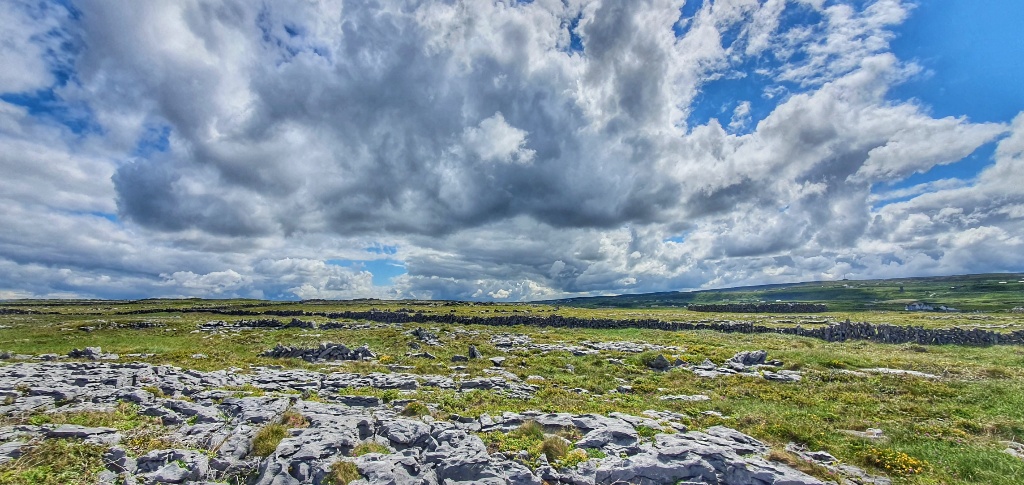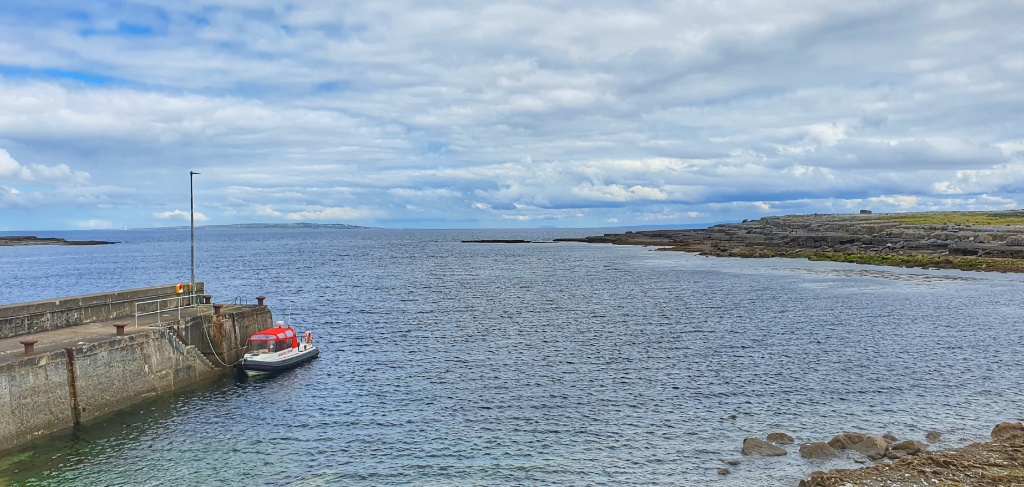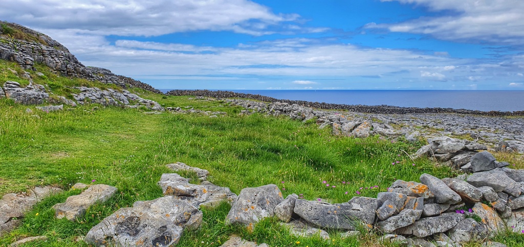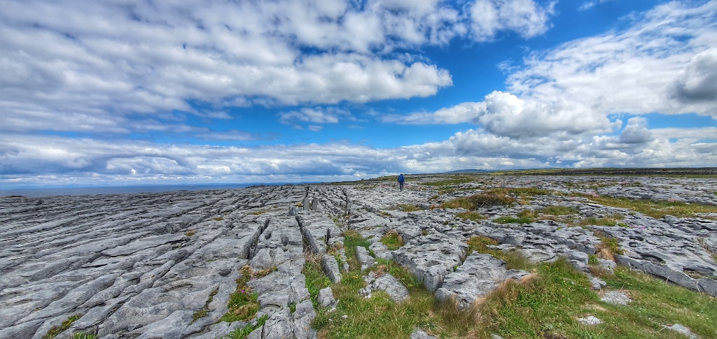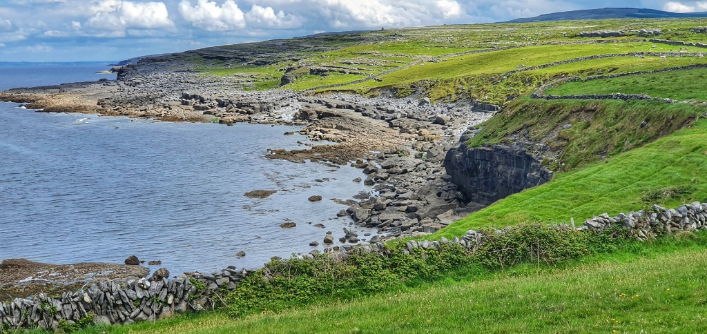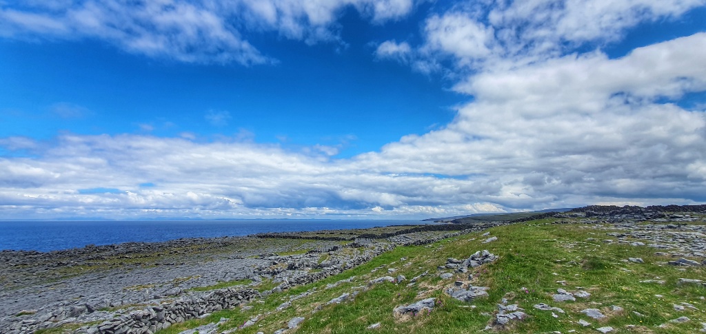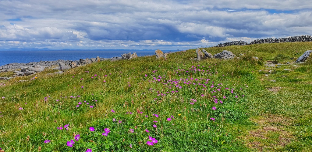 Doolin Pier is a small ferry port for day trips out to the Aran Isles so parking spaces were at a premium but having found a space we headed off in search of a trail. The ‘way’ would take us back to the road so instead we followed what looked like a well worn path but before long it was lost among the giant rocks that make up the coast line. At first it seemed easy walking but as we continued it became harder and harder. The rocks are uneven and some unstable, there are huge fissures between them and the rocks move underfoot. You can’t put your foot in a gap as you have no idea how deep it will be and it felt like we were playing some crazy huge game of hopscotch. We were about to give up and return but thankfully we spotted the path, much closer to the shoreline and headed for this.