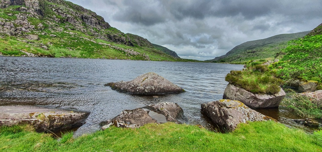 The name Gap of Dunloe comes from the Irish dun Lóich (“Lóich’s fort”), named after the chieftain of a clan who lived here in ancient times. The River Loe flows through the valley, linking its five corrie lakes: Coosaun Lough, Black Lake, Cushnavally Lake, Auger Lake, and Black Lough. When the great glaciers churned through the mountains 2 million years ago, they left massive boulders scattered about the valley,
