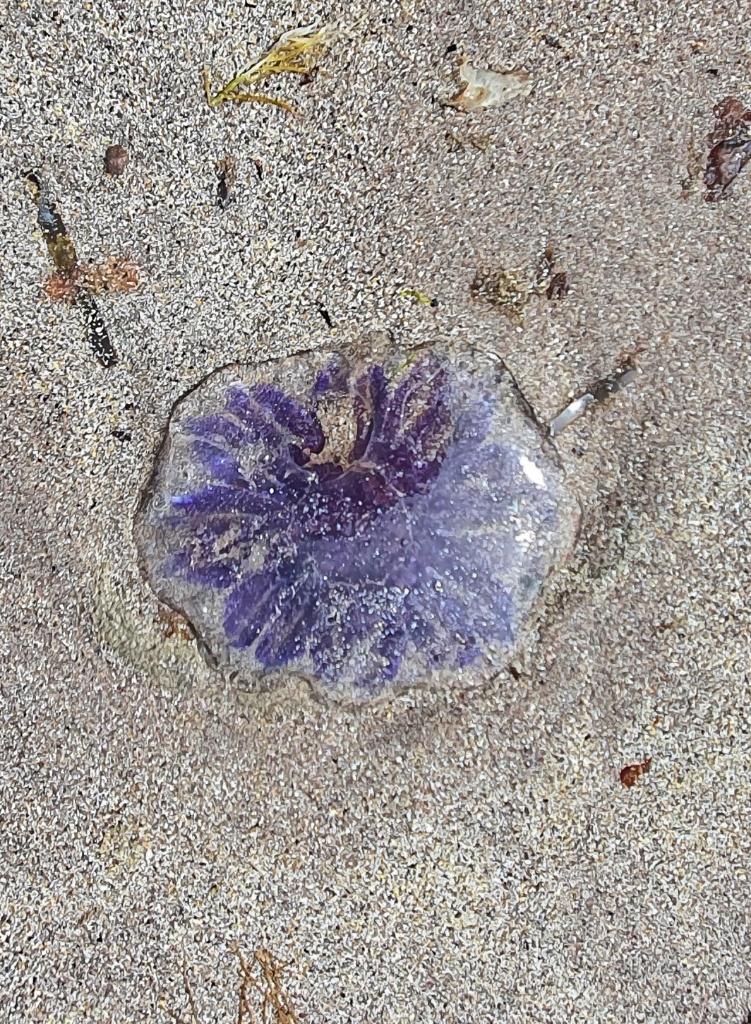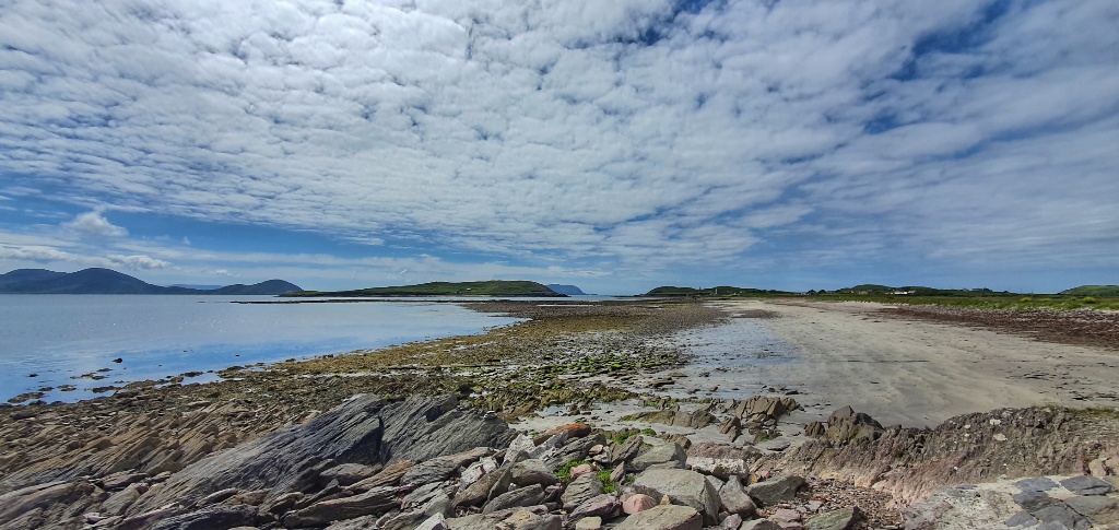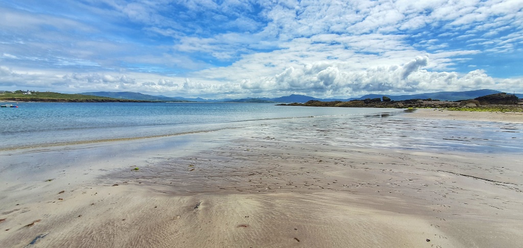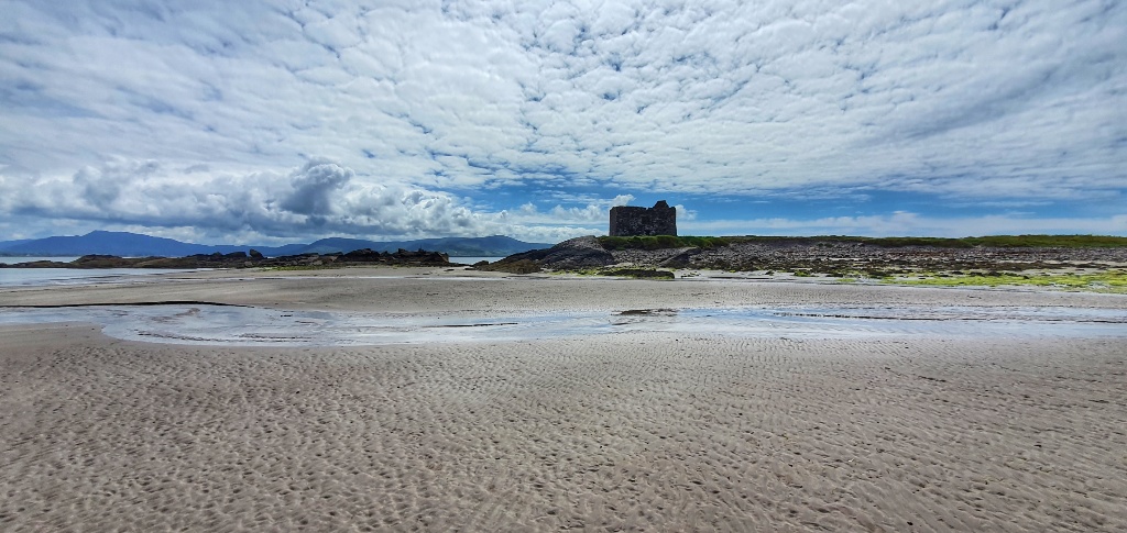 One such place took us to a car park and beyond to a huge huge bay. We walked to one end of the bay to view an old Abbey. Very little remains of the Abbey but the views were good. Then we walked back and around the shoreline, dodging jellyfish (we’ve seen lots on the beaches so I guess this is pretty common in Ireland). The sand is soft and golden and the sweep of the bay just went on for miles. It is well protected from the Atlantic by the smattering of islands and it was just glorious. We could have stayed for much longer but time was pressing so after a long walk along the sea shore we returned to the car.