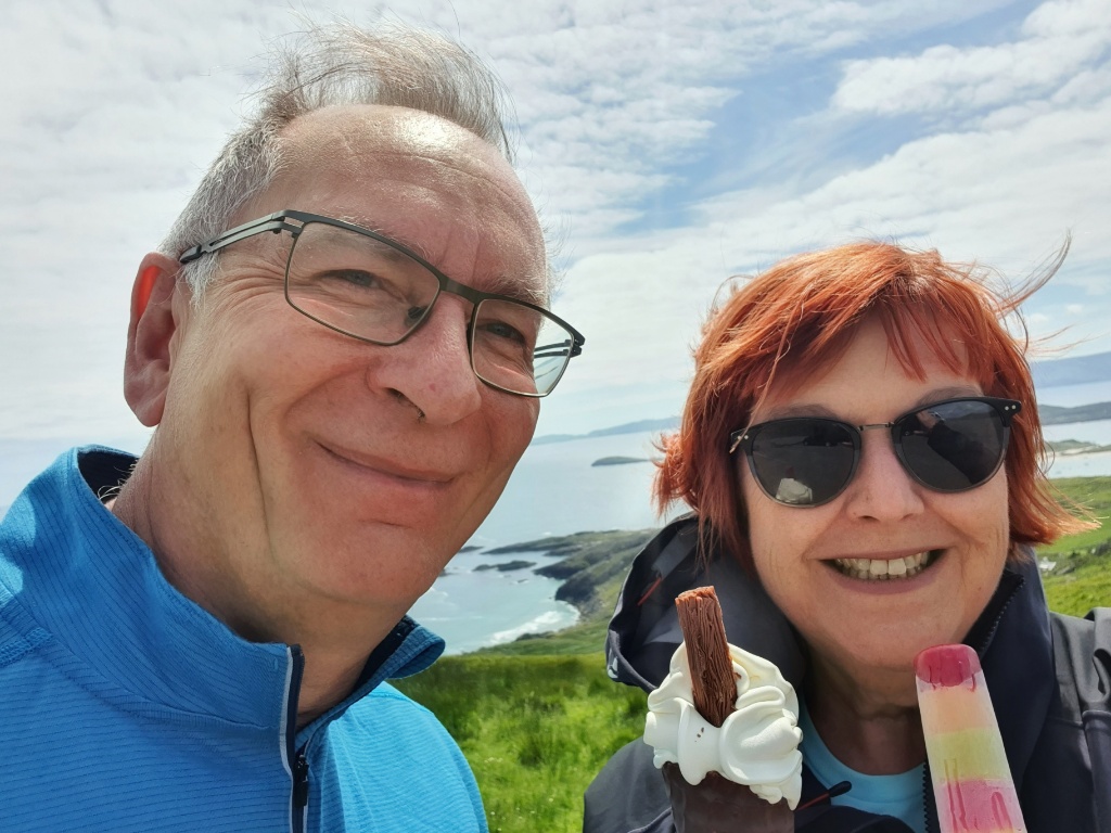 More driving, more stopping, more strolling. Today has been all about green hills rolling down to grey cliffs or golden beaches or a blue sea under an even paler blue sky. And if not walking along deserted sandy beaches we’ve been driving through country lanes lined with great froths of white daisies or yellow buttercups. It feels like Ireland might live in the permanent state of Spring. It was another glorious day. It wasn’t the day we planned but it turned out to be a glorious alternative that we would have never seen. What lucky retirees we are.